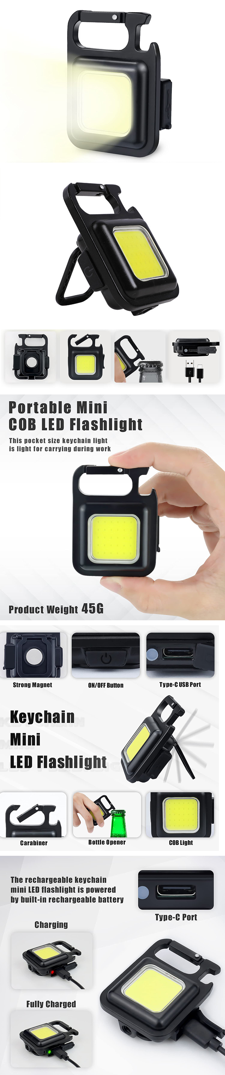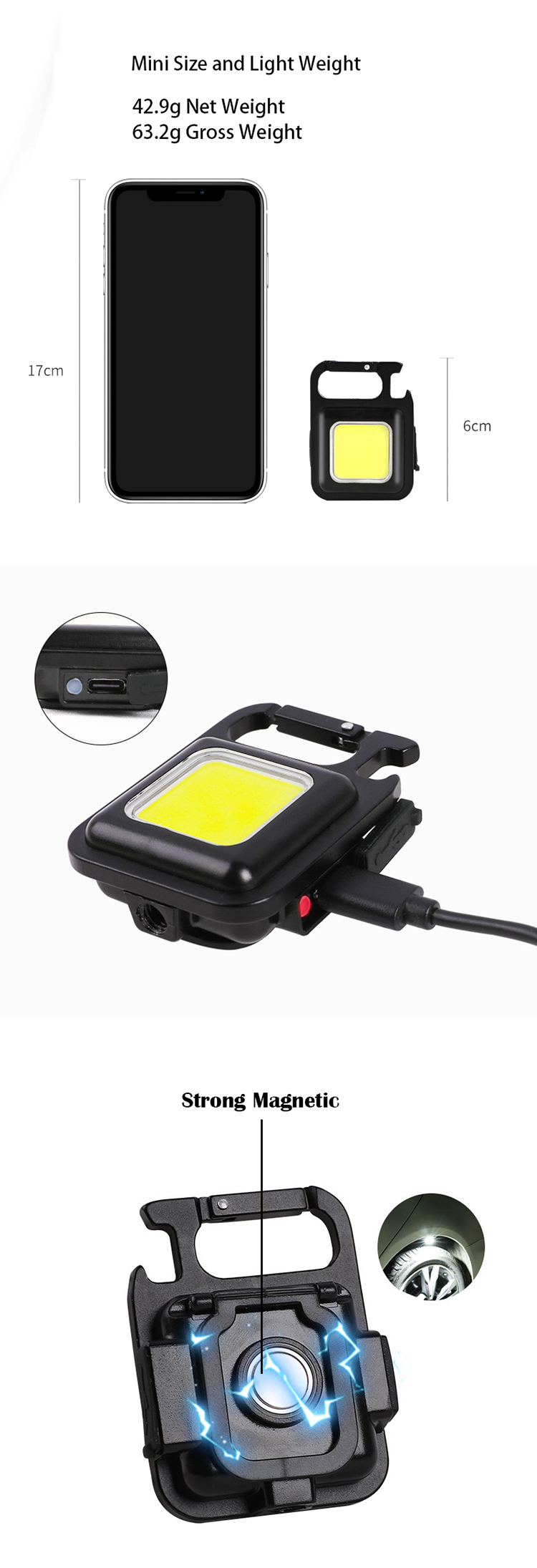 Recharge Strong Magnet Cob Light Mini Portable Key Rings Camping Lantern Keychain Flashlights with Folding Bracket Bottle Opener