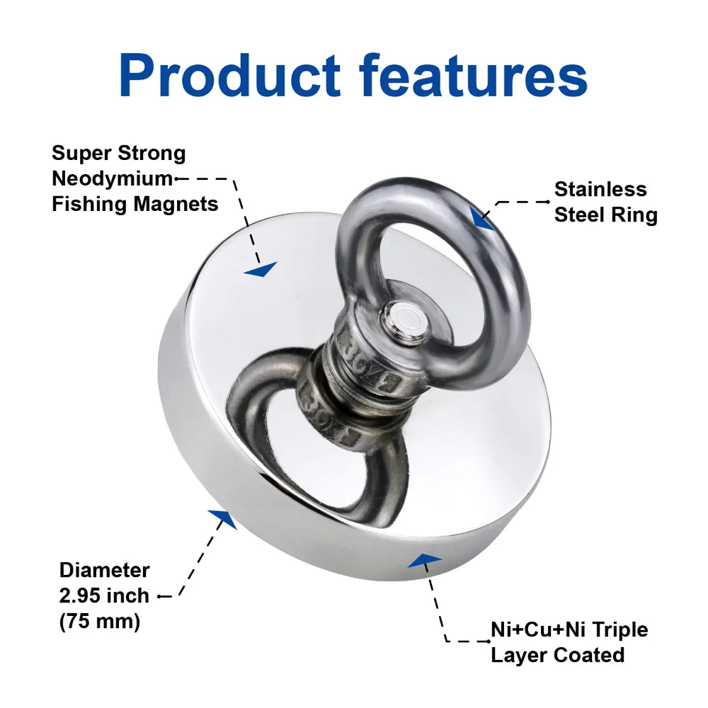 MULTI USE – Unique design with Countersunk Hole and Eyebolt Great for salvaged of various iron-containning nickel material underwater and Good idea for magnet fishing, lifting, hanging, retrieving applications. Have fun to searching items like eyebolt, screws, hooks, fasteners and so on in your warehouse garage or yard.