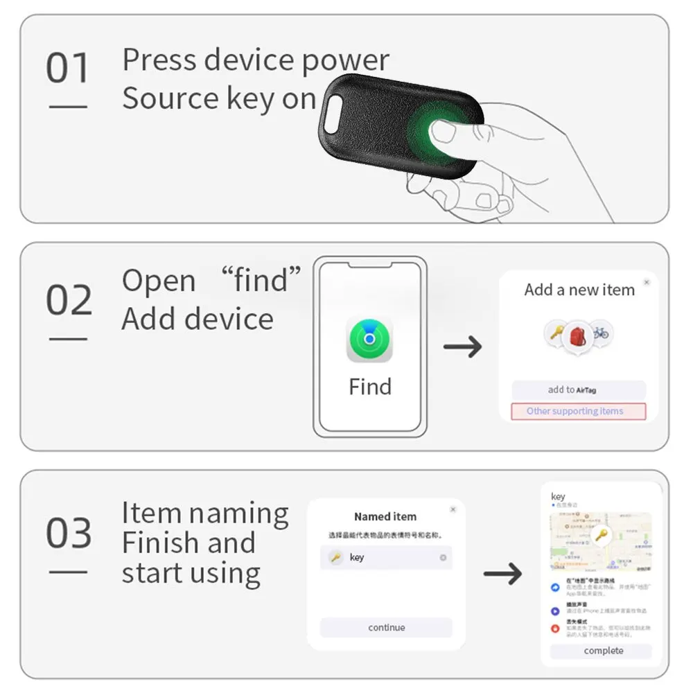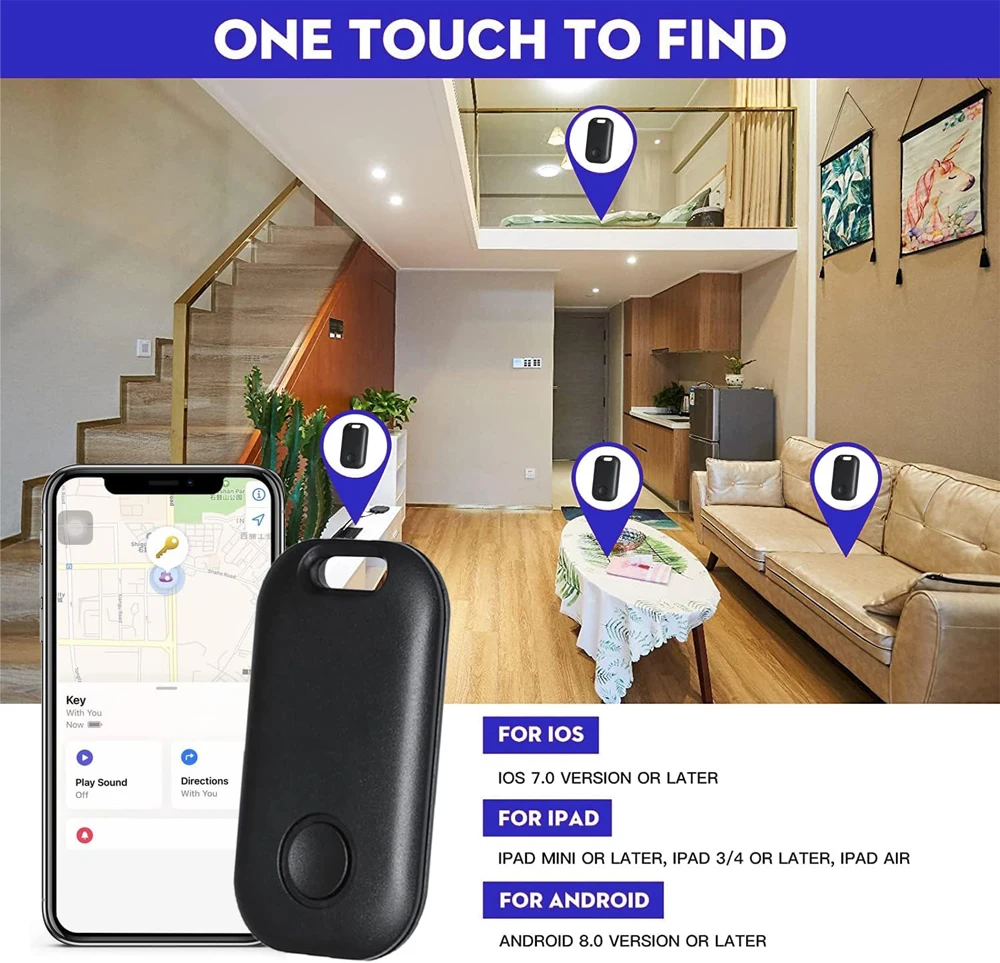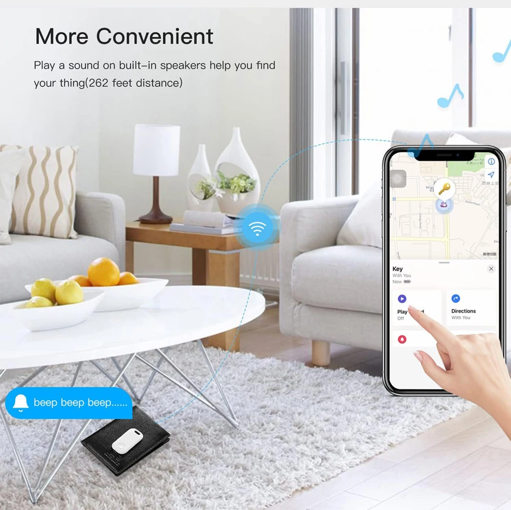 When connected, open the Iphone or ipad that comes with the Apple application "Find", click the "Play Sound" button, the device will emit a "reminder" sound, and you can quickly find the item according to the sound prompt.