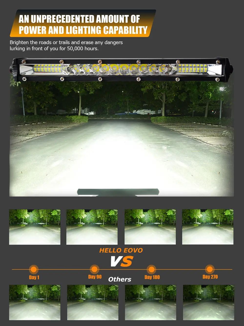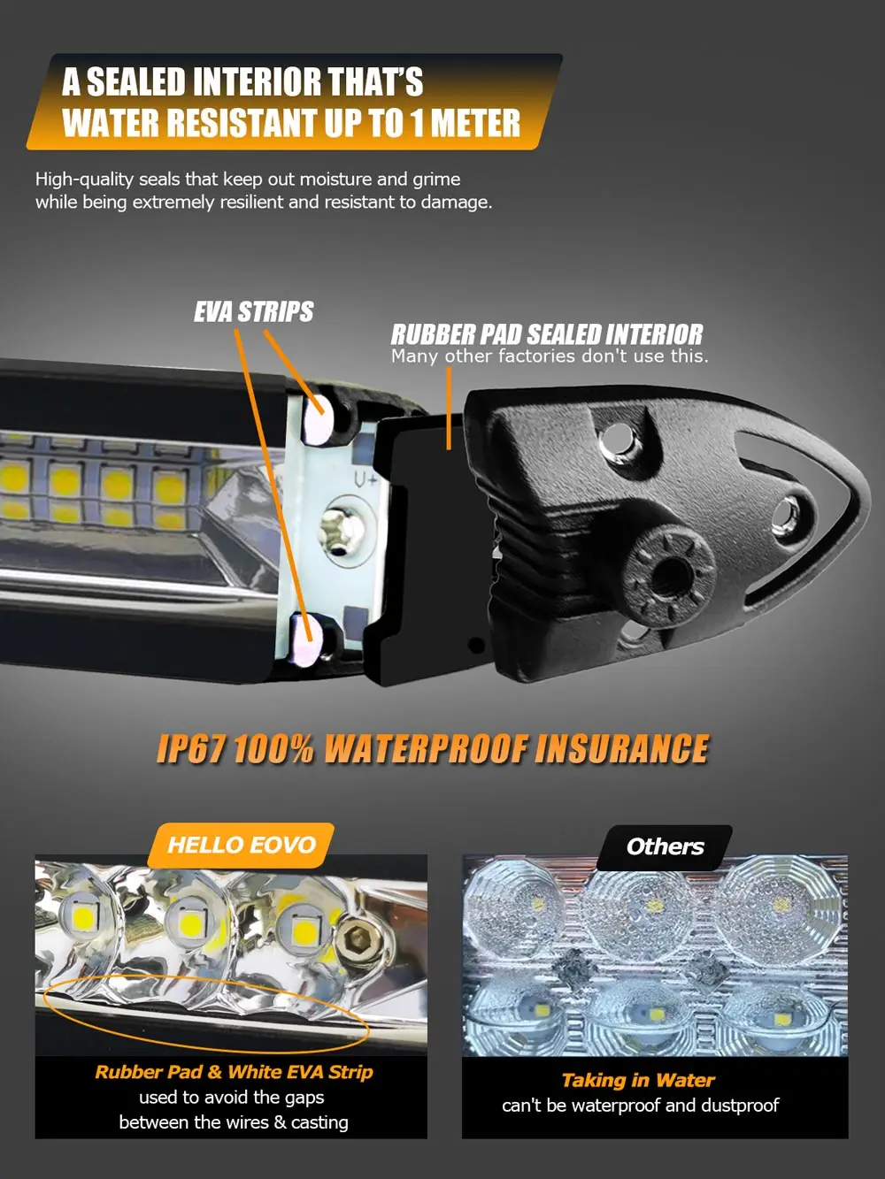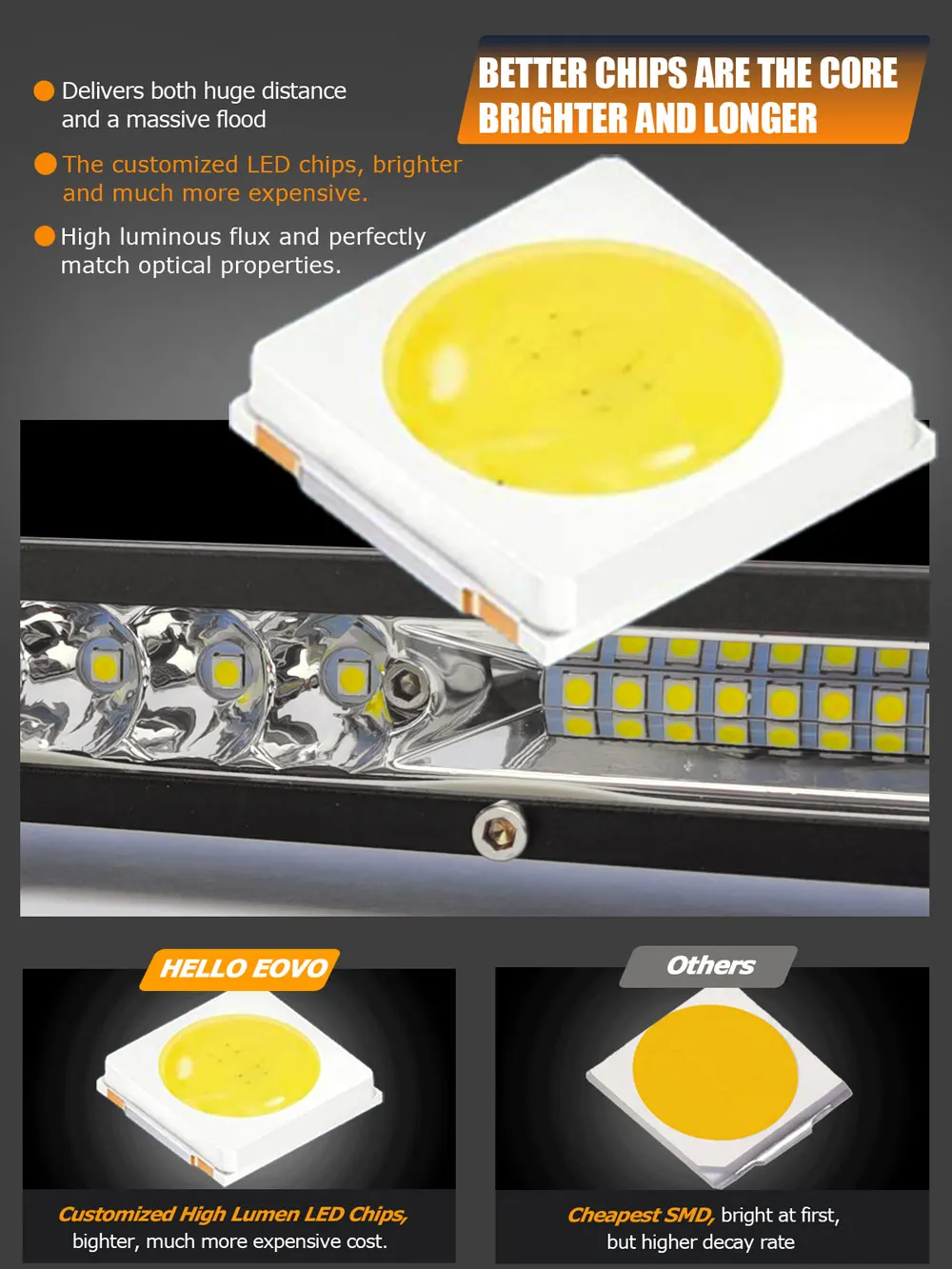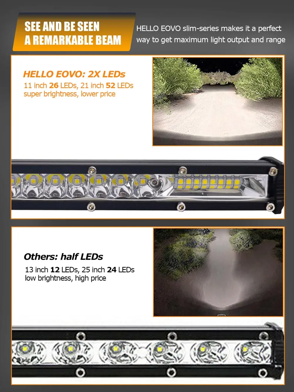 Do you want a light bar that gives a good spread of light without compromising distance? Now you can have it, with HELLO EOVO revolutionary customized LED. Using a world-leading technology, HELLO EOVO's LED bar delivers both huge distance and a massive flood in one insane package.