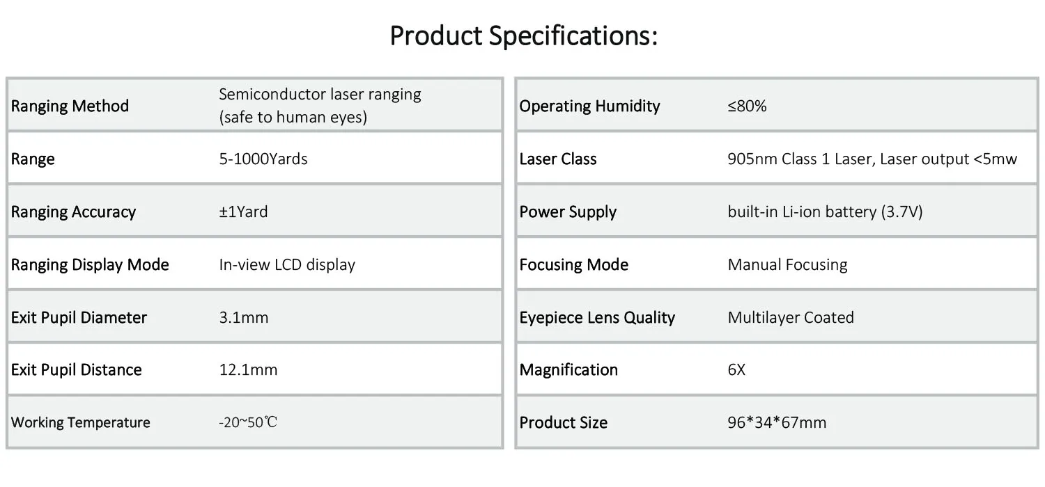 · [Rechargeable and Portable]- The rangefinder is equiped with rechargeable built-in Li-ion battery, charging is super easy. The product is compact, light weight and durable, the weight is only 4.94 ounces (140g) and size is 3.8*1.4*2.6 inches(96*34*67mm). With rain-proof, it's perfect for carrying while hunting or golfing or measuring outdoor. In the package, it includes a pouch , a lanyard, a lens cleaning cloth, an USB cable and manual.