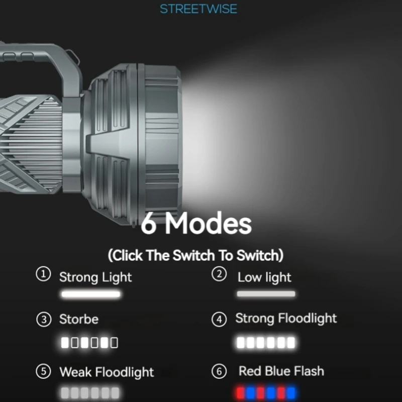 【6 Modes】: Strong-Low-Strobe-Strong Floodlight-Weak Floodlight-Red Blue Flash