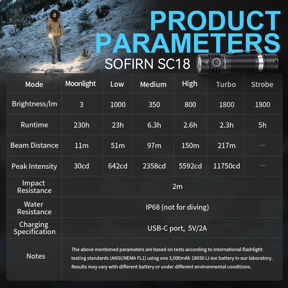 3. Simple Operation: Access different outputs with the side electronic switches for any daily use scenario. Battery indicators on the side switch to get a battery level reminder at a glance. It features six brightness levels: Moon(3Lm)/Low(100Lm)/ Medium(350Lm)/ High(800Lm)/ Turbo(1800Lm)/ Strobe(1800Lm).