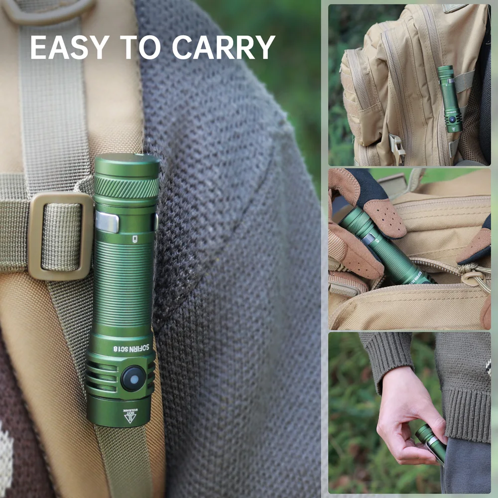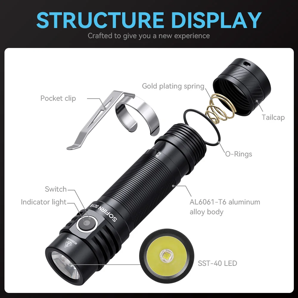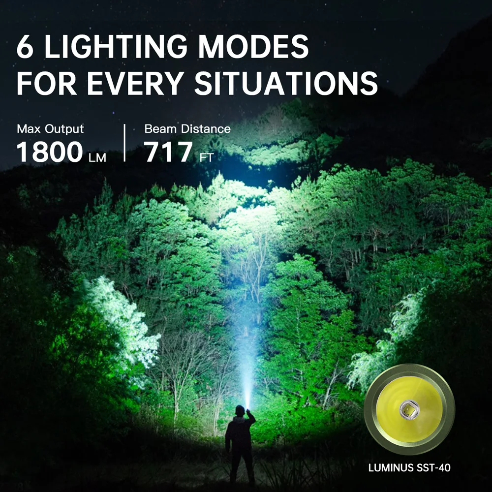 1. Leading Performance: This LED flashlight is equipped with Luminus SST-40, easily lighting up the path in front of you with significantly improved throw: it delivers a maximum output of 1800lm at a distance of up to 217 meters, producing a particularly soft and balanced beam profile to preserve comfortable vision. -