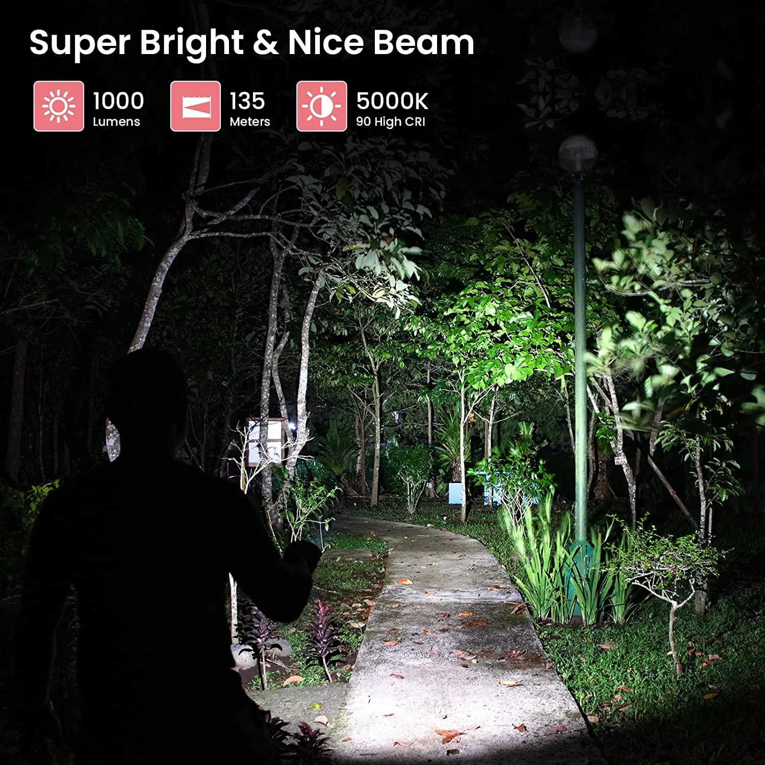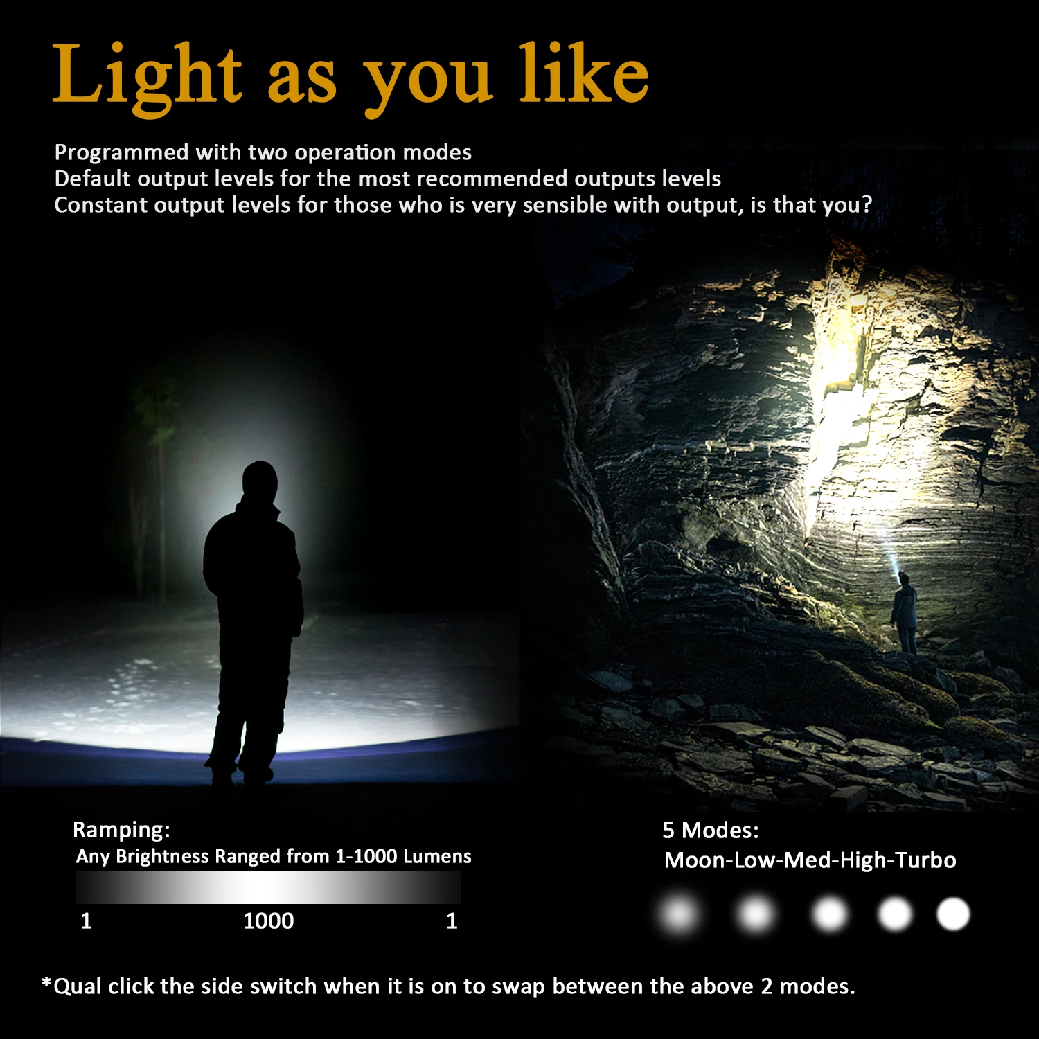 Small but super bright LED torch– Full length 73mm, Weight 37 grams, Powerful LH351D 5000K LED generates up to 1000 lumens with 135 meters visibility; Side Switch Control 5 modes (Moondlight- Low- Medium- High- Turbo)+ 3 flashing modes (Strobe- SOS- Beacon) + stepless ramping up or down: ( from 1 lumen to 1000 lumens), get your favorite brightness freely