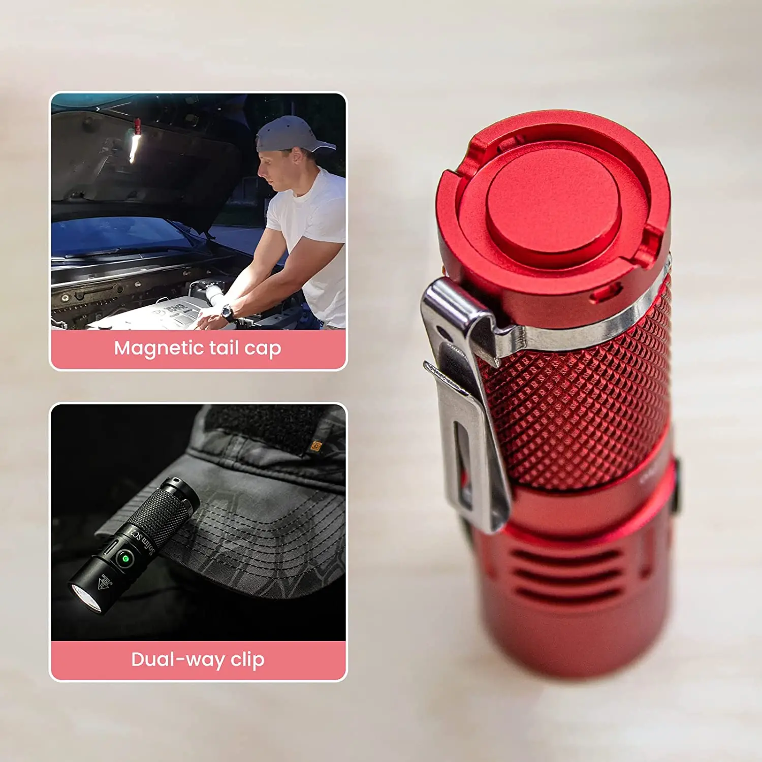 With removable dual-way clip, you get a headlight on wearing it on hat; With magnetic tailcap, You get a hand-free tent light / mini spotlight on attaching it with metal ; you get a keylight or boutique on connecting it with keychain, ; you get a emergency flashlight on putting in your pocket or bag