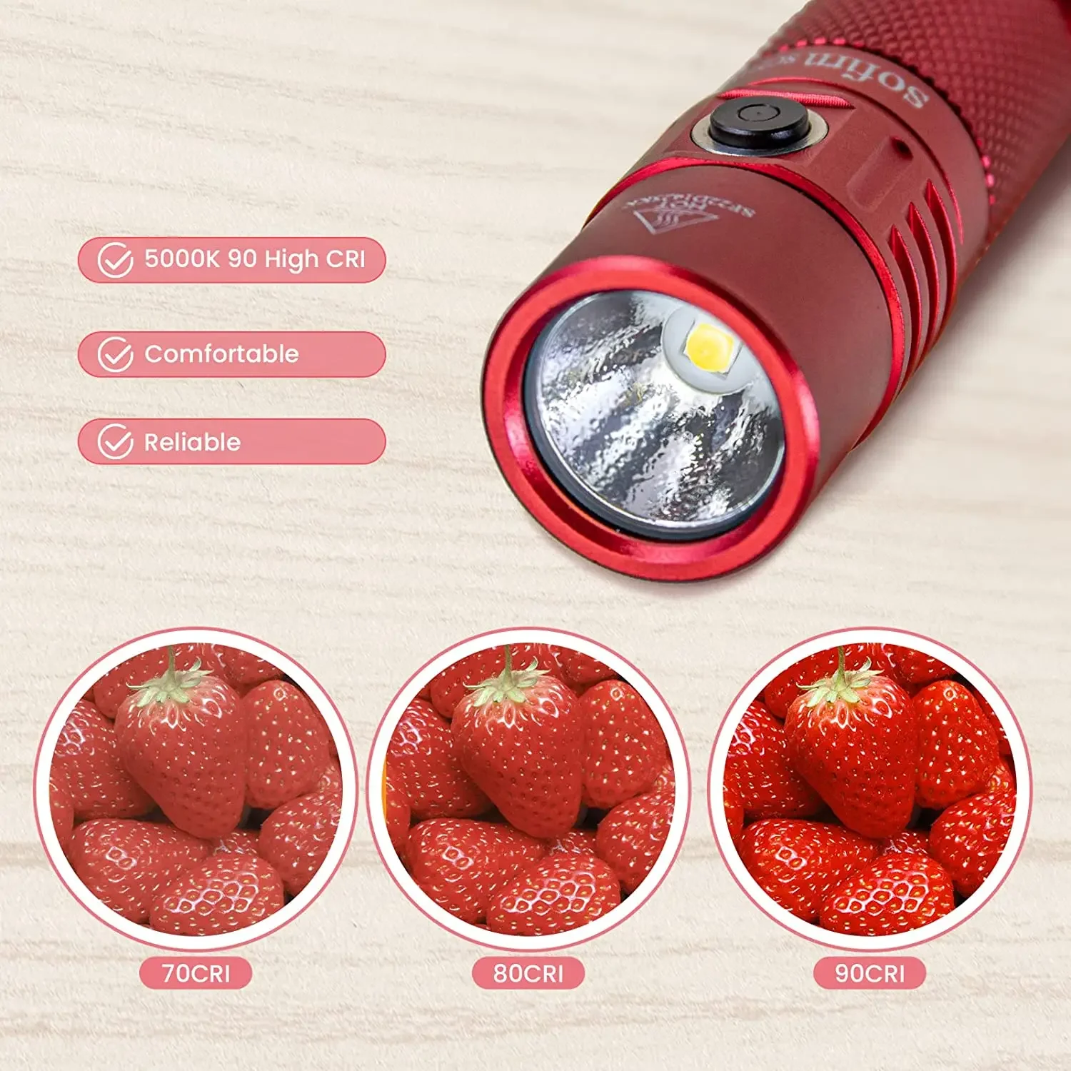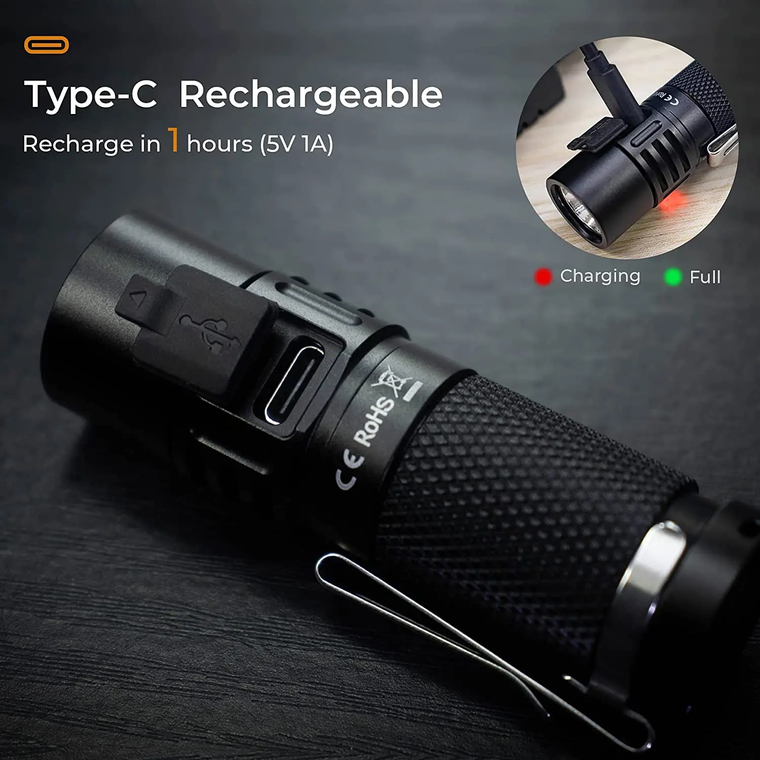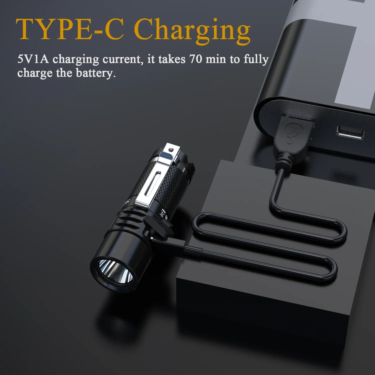 2, Three-color power level indication: Once the light is turned on, the power indicator located in the center of the side switch shows the power level in three colors (Green: Power>70%, Red: Power is between 30% and 69%; Red flashes: Power<10%).