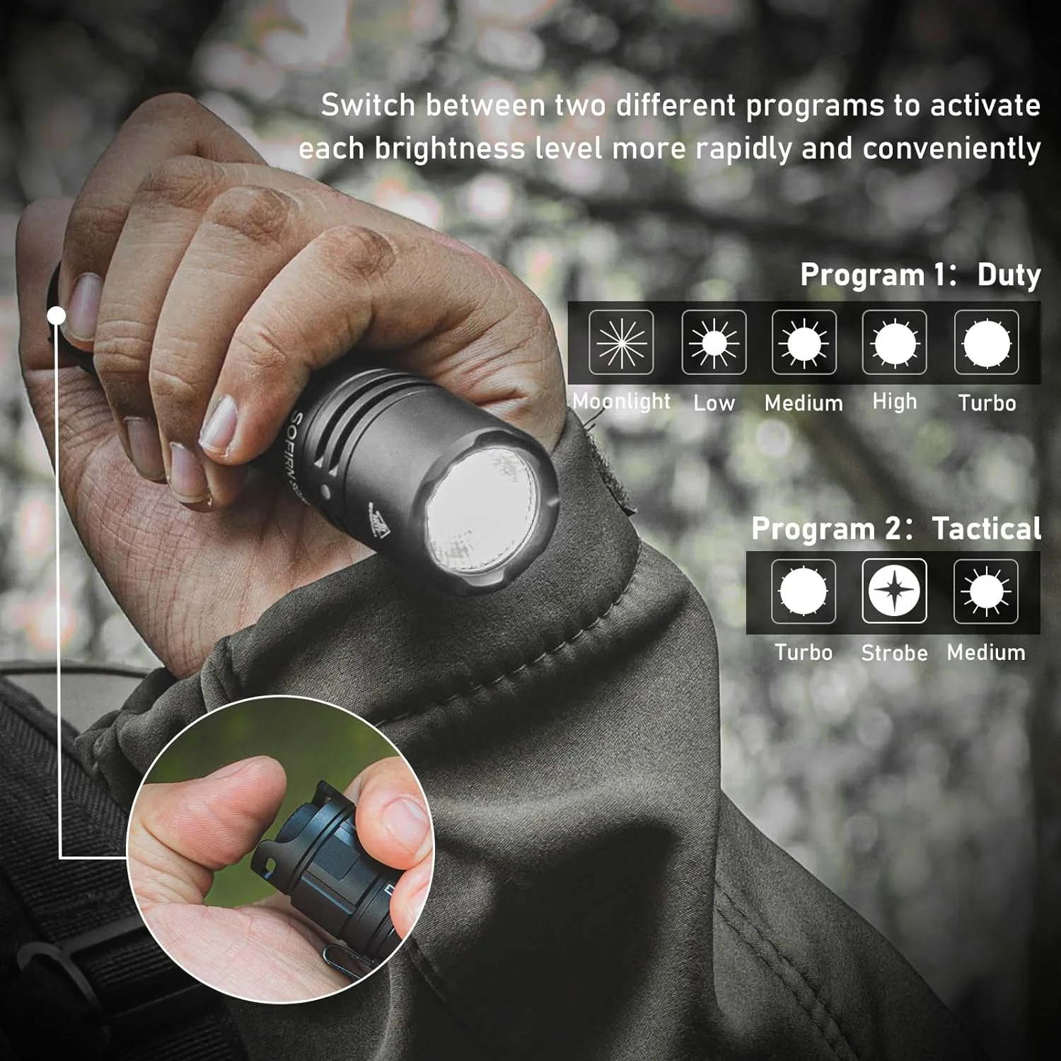 Duty& Tactical : Whether you need a simple yet strong rechargeable flashlight for night work, a multi-mode light for camping and hiking, or a kid-friendly beam, the versatile SC28 is up for the task. Switch between 3 different programs to access different lighting mode settings, with one that always meets your needs.