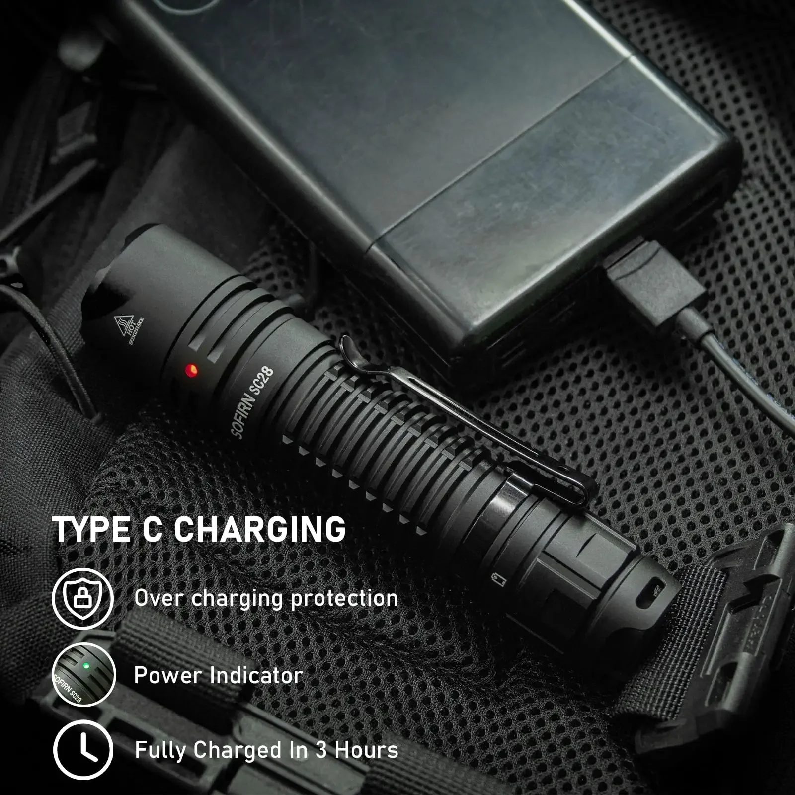 Type C Rechargeable & Indicator: This camping flashlight has a convenient built-in USB-C charging port to power it up. Clear LED indicators let you monitor charging progress and battery level at a glance. While charging, the light glows red then turns green when fully charged so you know it's ready. Below 25%, the LED flashes red as a recharge reminder. With type c port and intuitive status lights, keeping your SC28 charging simple and hassle-free.