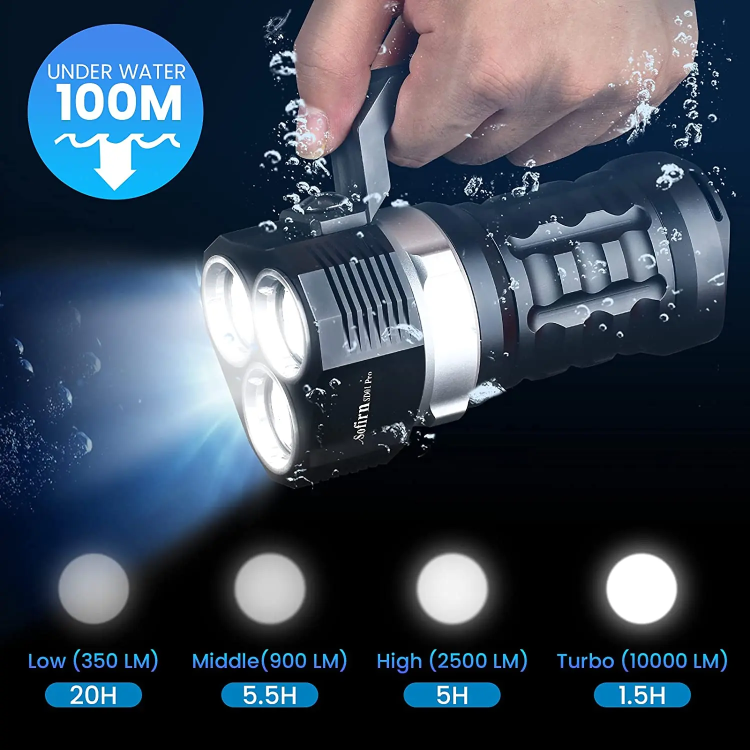 SD01PRO uses a magnetic control switch. Rotate the ring to turn the light on/off and to change modes from left to right between Low, Medium, High and Turbo.