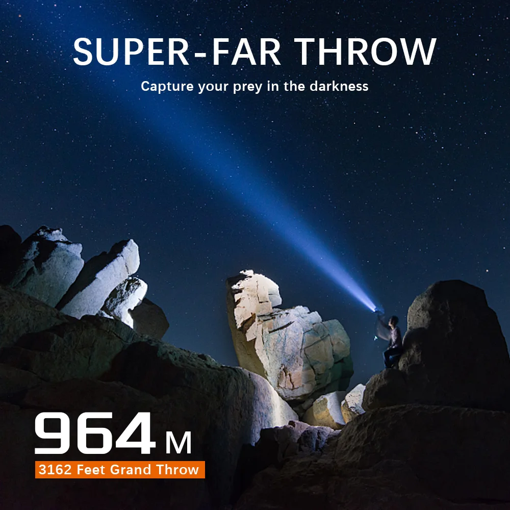 Extra-long irradiation distance: Ultra-long distance, powerful power, the longest irradiation distance up to 964 metres, suitable for camping, hiking, fishing, climbing and other scenes.