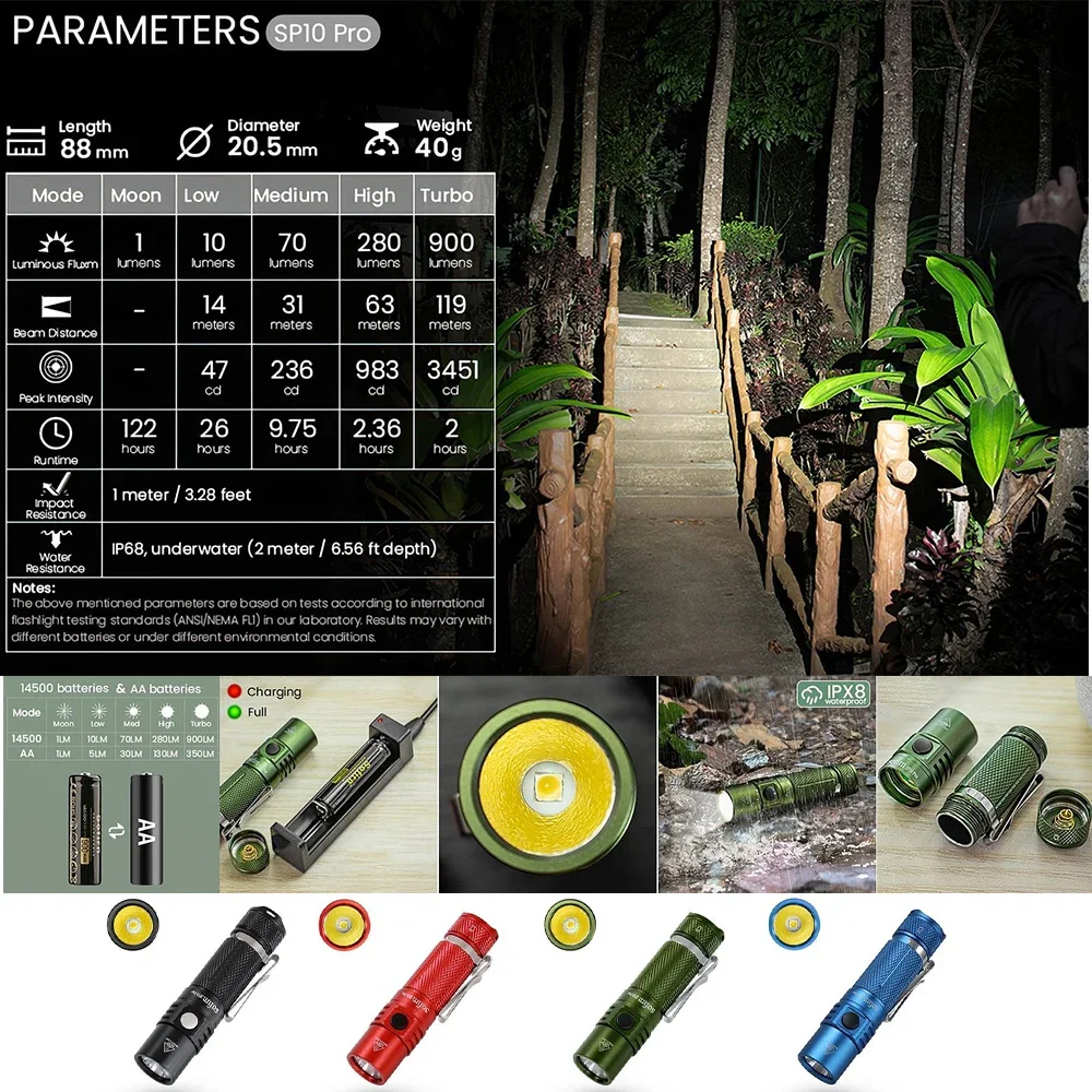 Battery options: 1x 14500 Li-Ion battery, 1x AA alkaline battery, 1x AA NiMH battery