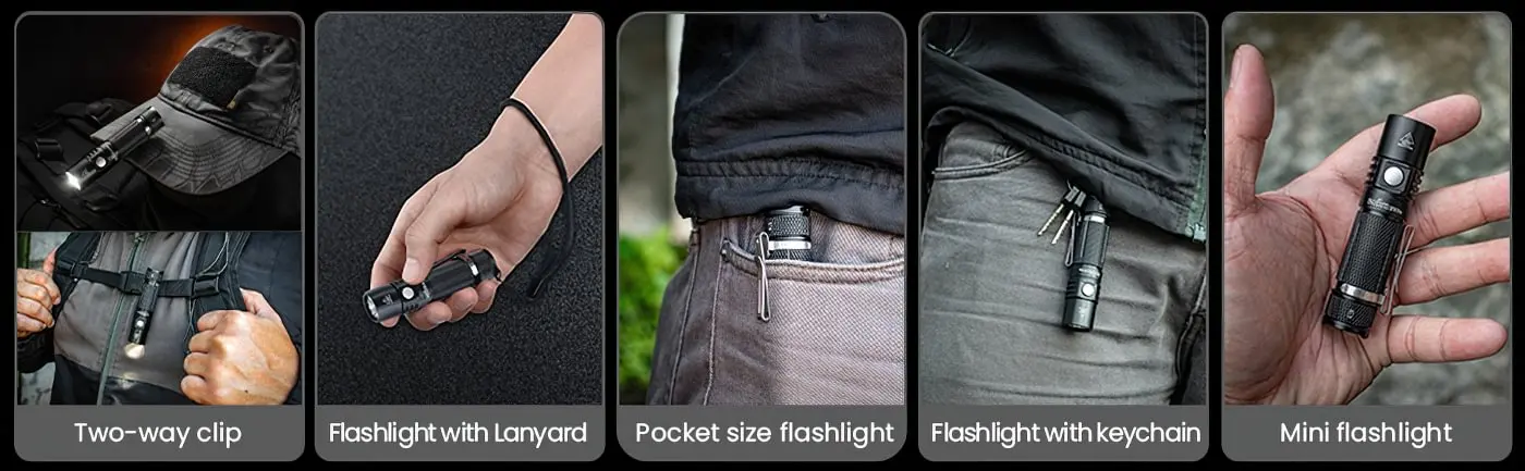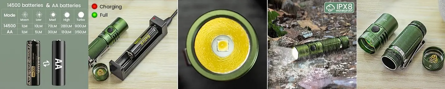 Battery options: 1x 14500 Li-Ion battery, 1x AA alkaline battery, 1x AA NiMH battery