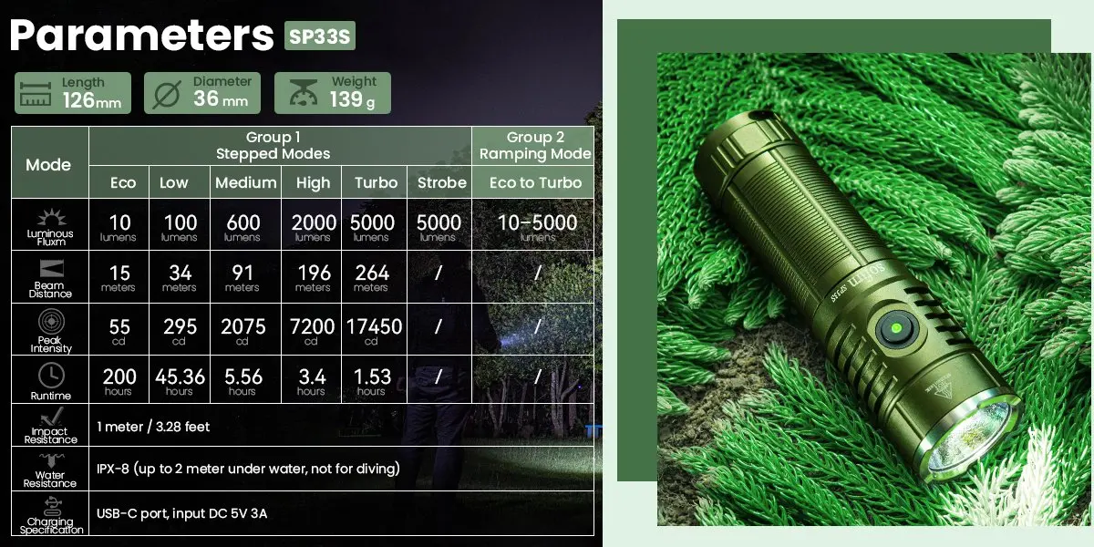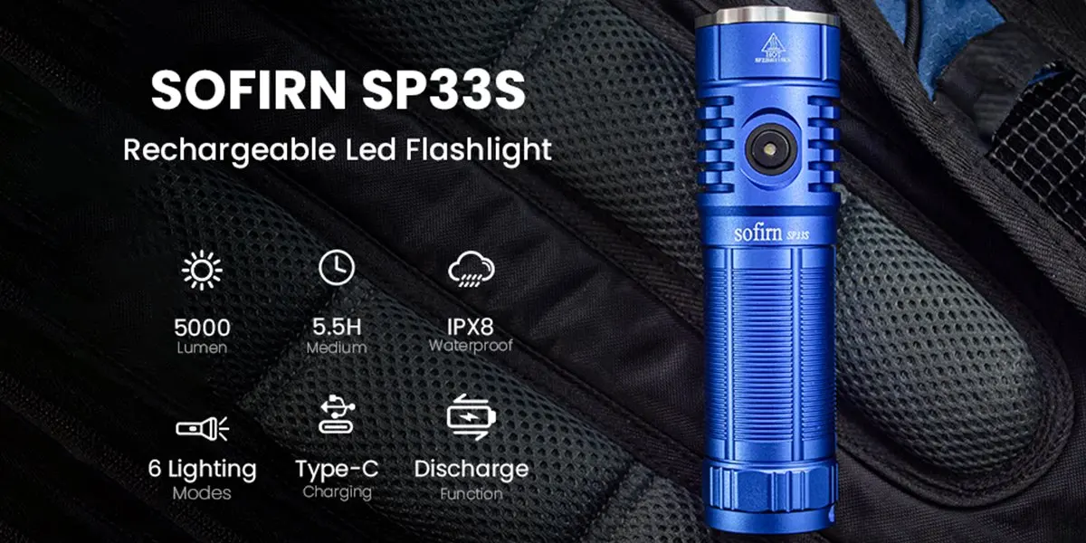 SP33S is a upgrade version from SP33V3, it update to 5000lm output and Micro USB rechargeable port.It is a powerful, versatile EDC / outdoor flashlight designed for home, EDC or outdoor activities like camping, hiking, fishing or hunting. It can be operated from a single 26650/21700 Li-ion rechargeable battery. It features two mode groups: Group 1 with 6 modes and Group 2 with ramping capability.Sofirn SP33S delivers a maximum output of 5000 lumens, with a maximum range of 264 meters (264 yards).