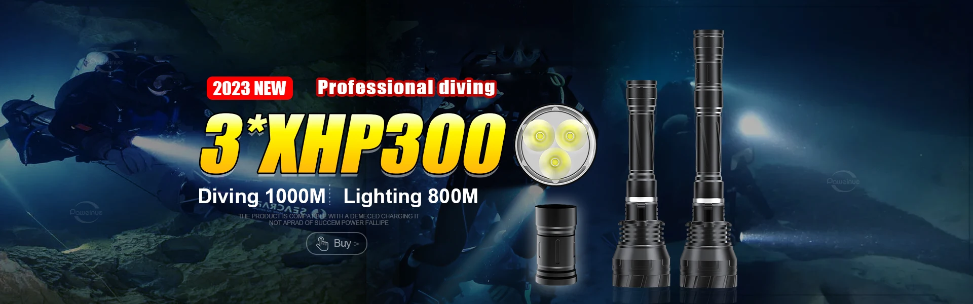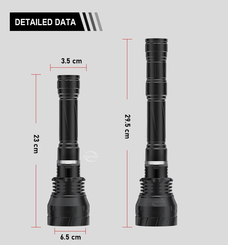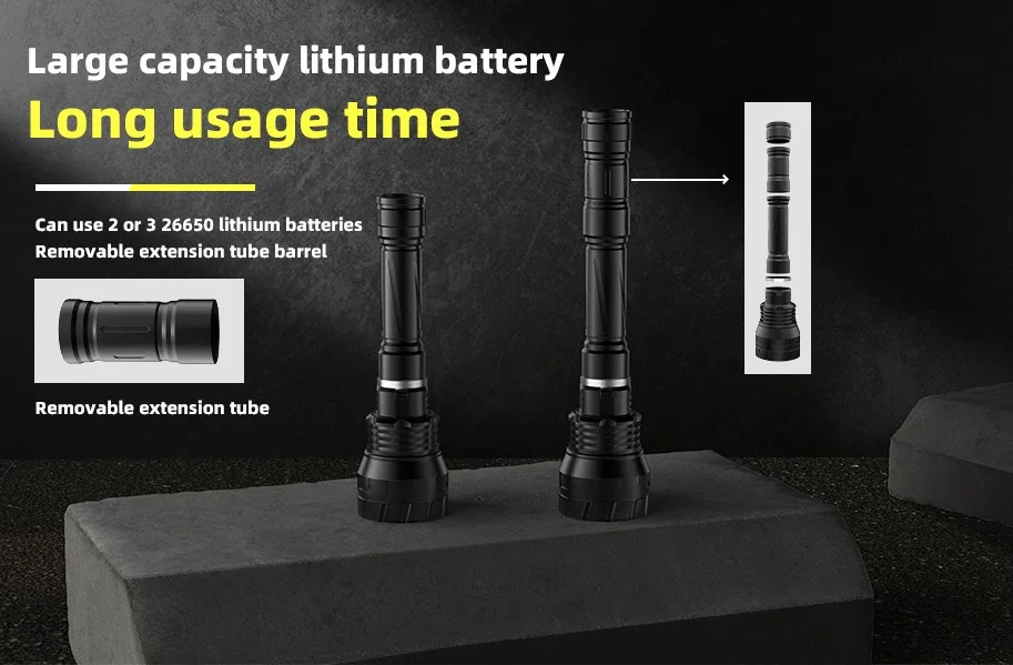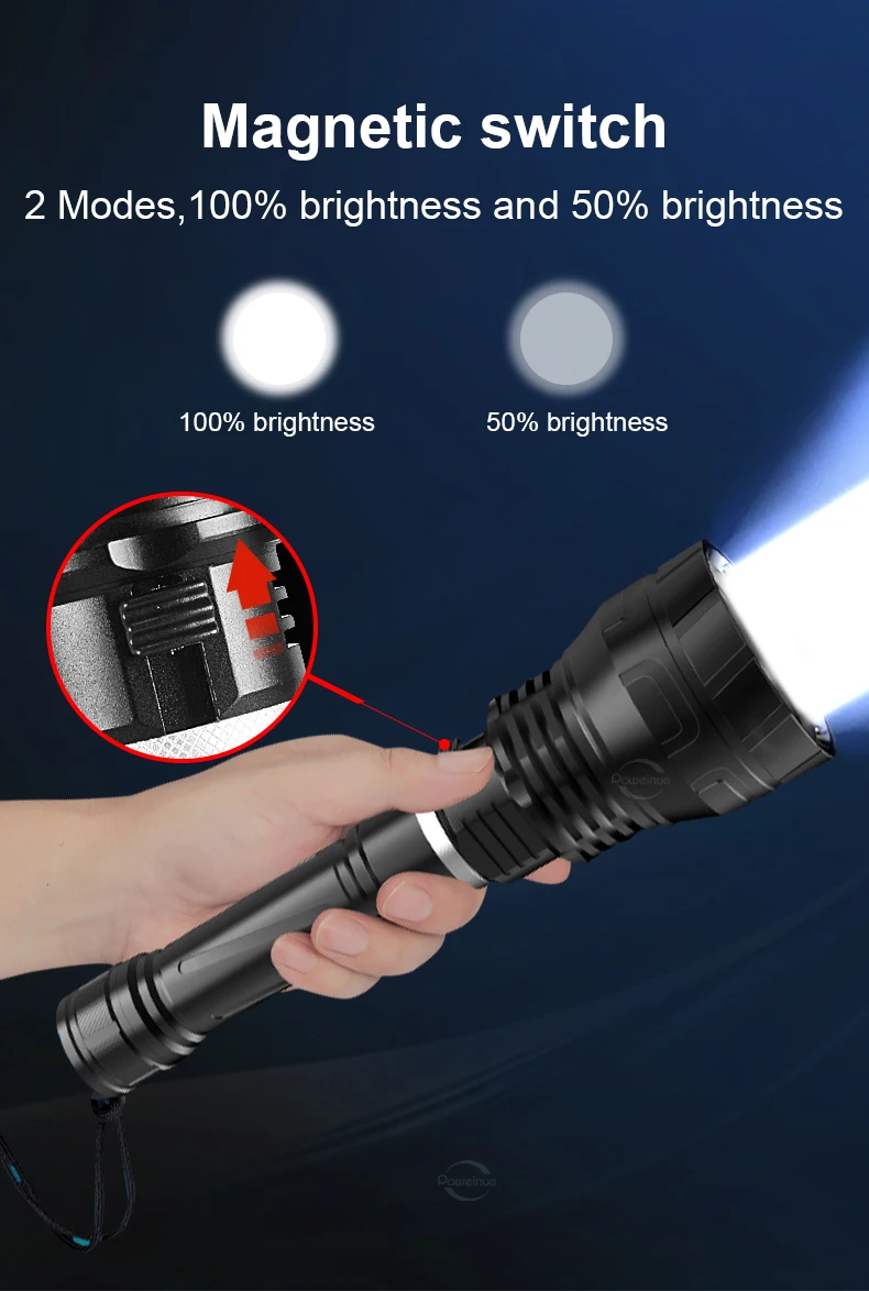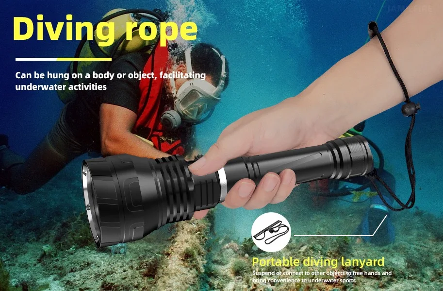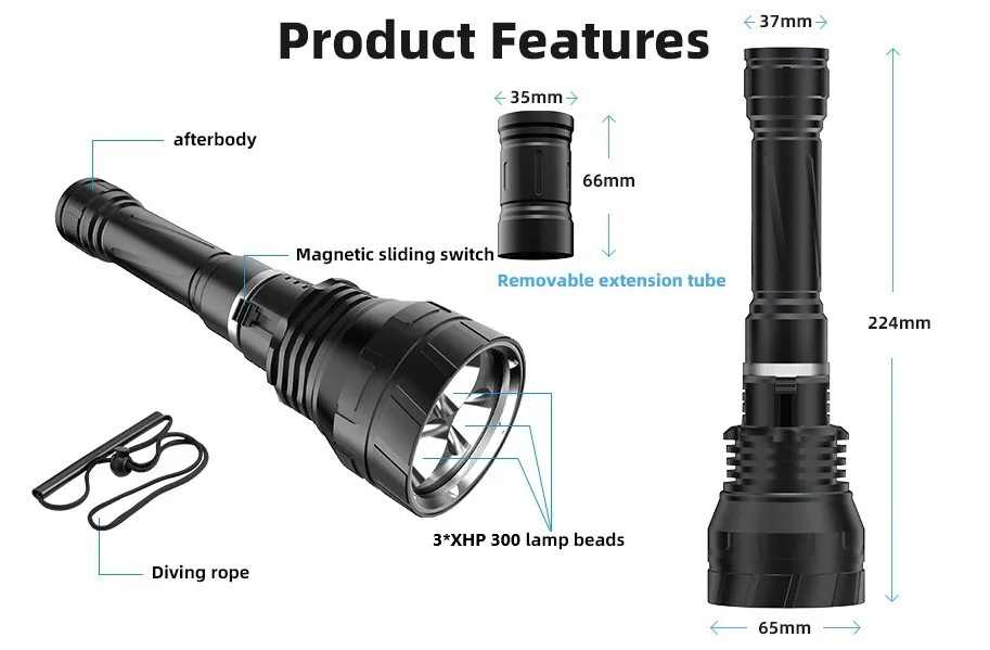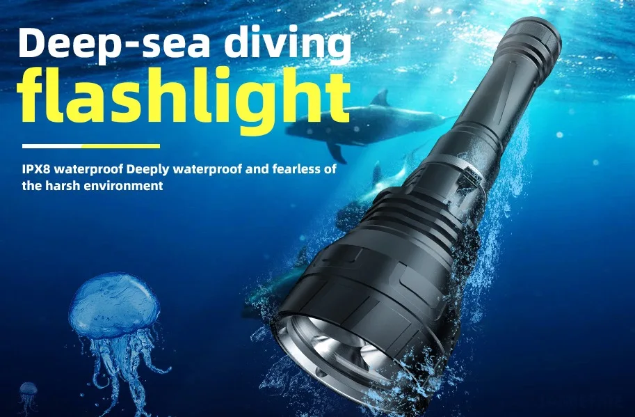 The newly upgraded diving flashlight is equipped with a 3 * XHP300 high-power wick, combined with a high output of 10000 lumens and a long beam distance, which can continuously provide a safe and bright lighting environment underwater. The IPX8 waterproof level, magnetic switch, and professional pressure resistant waterproof structure design support underwater diving at a depth of 1000M, avoiding internal deformation of the flashlight due to excessive water pressure in deep sea areas. Using a 3 * 18650 large capacity battery, it can maintain high brightness lighting for 4-12 hours. It is equipped with a high-precision intelligent chip, with overheating protection, and the surface is treated with a new generation of diamond grade anti-corrosion oxidation treatment, resulting in a longer service life.
