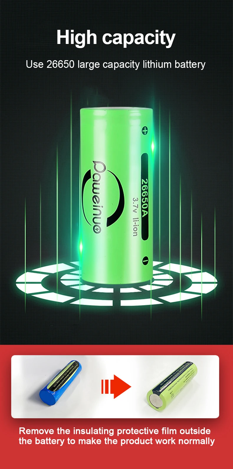 ❃ Lighting time: 4-6 hours for 18650 batteries; 6-12 hours for 26650 batteries