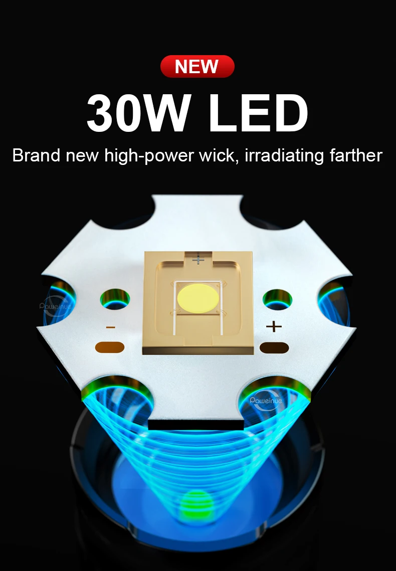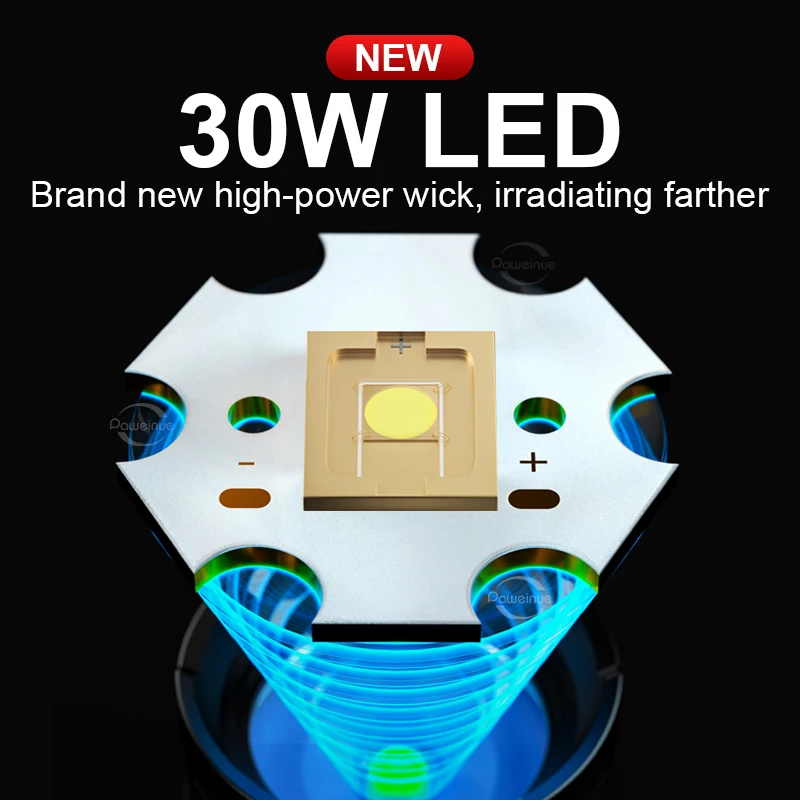 🔦 30W white laser led wick, the brightness can reach 3000-5000lm, because of the circular wick design, it can achieve amazing light gathering ability, with the high light transmission focusing lens, the lighting distance can exceed 1000m, very suitable for long-distance exploration and lighting.