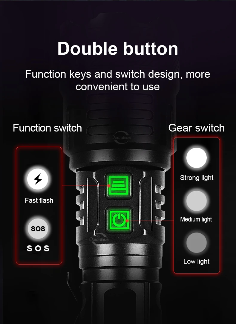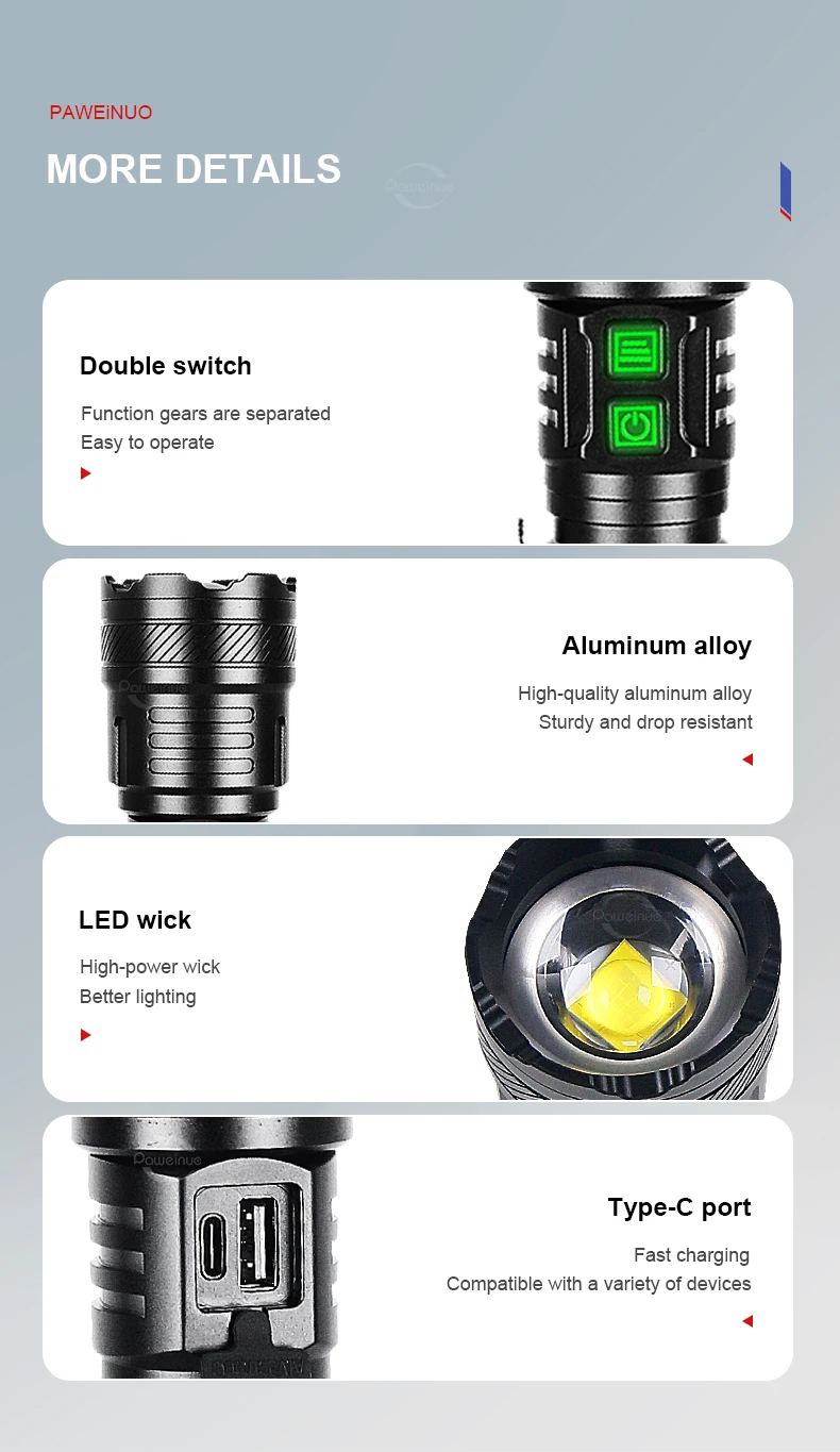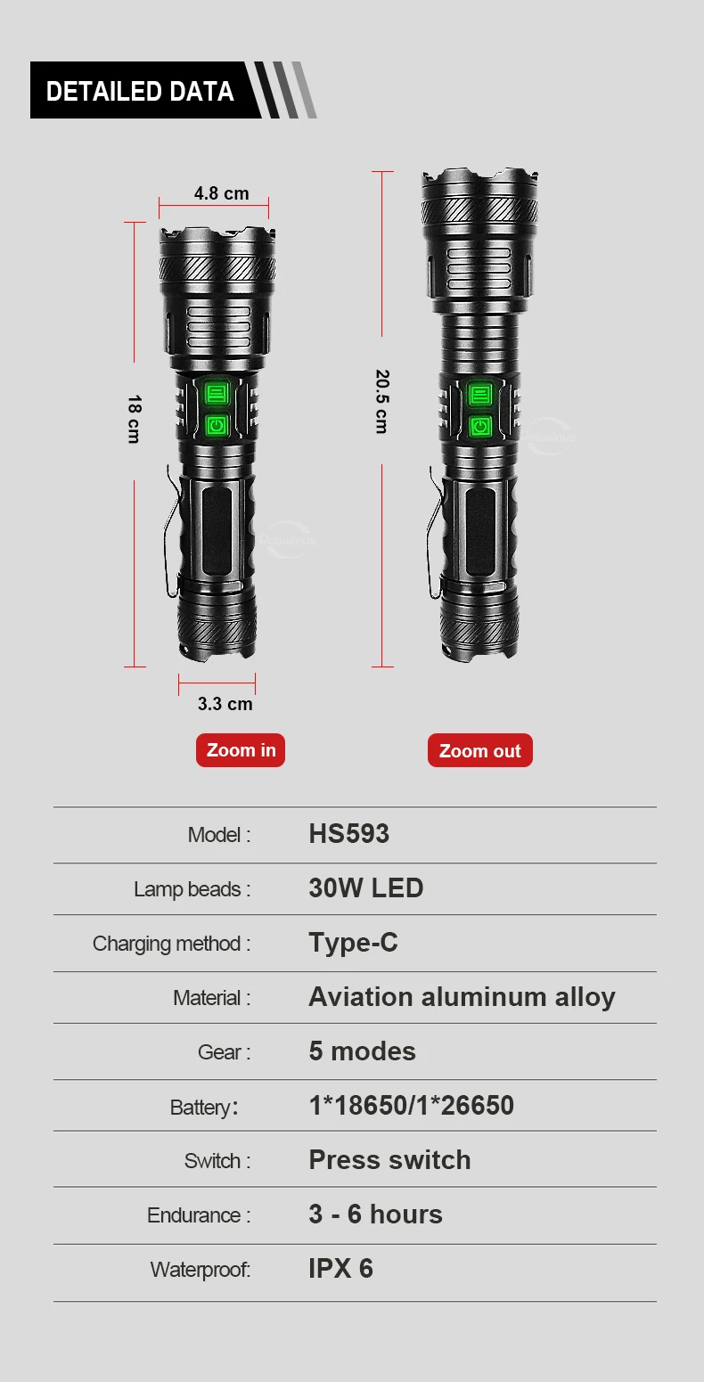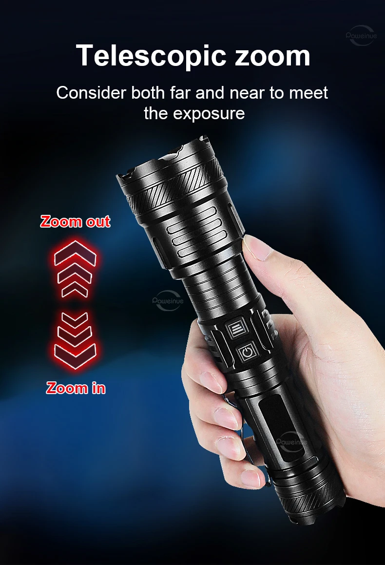 🔦 Telescopic focusing, the focal length can be adjusted according to the actual use scene. Wide-angle illuminates a large area at close range, suitable for relatively short-distance search or illumination; telephoto provides focused and concentrated light, suitable for long-distance observation or illumination.