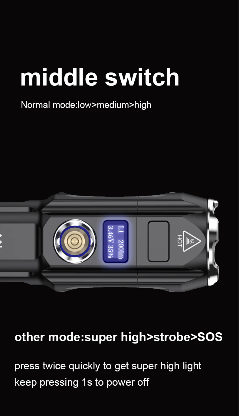 Six modes, press the central switch button to turn on the light source, and then continue to press to make changes. 3 gears: low light-medium light-strong light turn off the sequence cycle, any gear double-click the switch to turn on the extremely strong light, and then continue to press to change (extreme lighting> flash> SOS> return to normal gear cycle), press and hold the switch for 1 second It can be turned off.