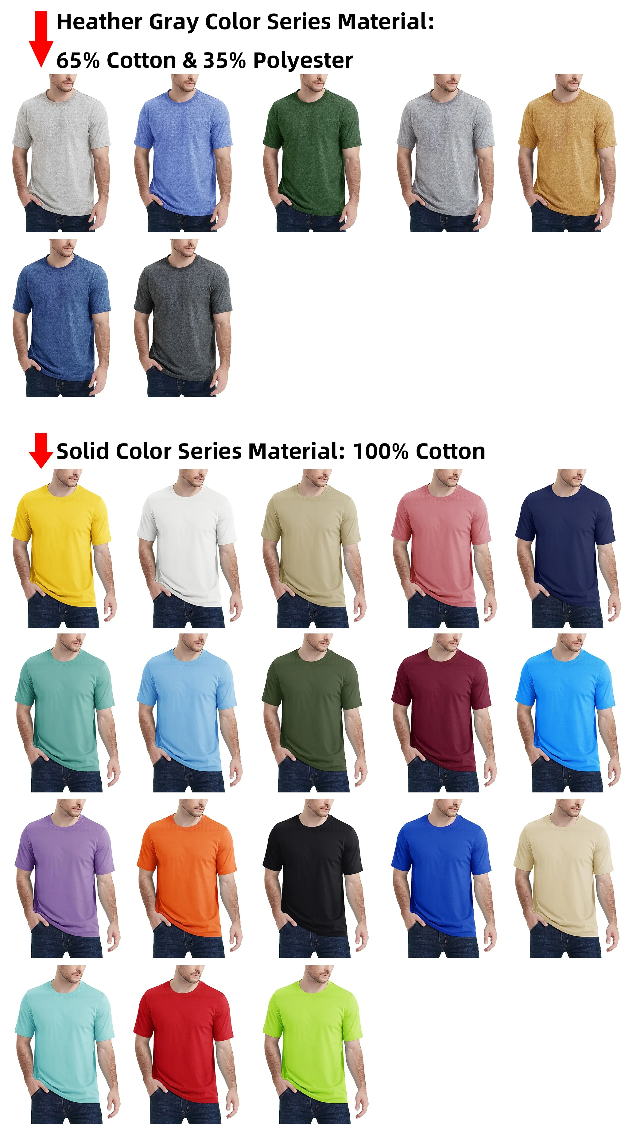 Heather (ash) Gray Color Series: 65% Cotton & 35% Polyester.