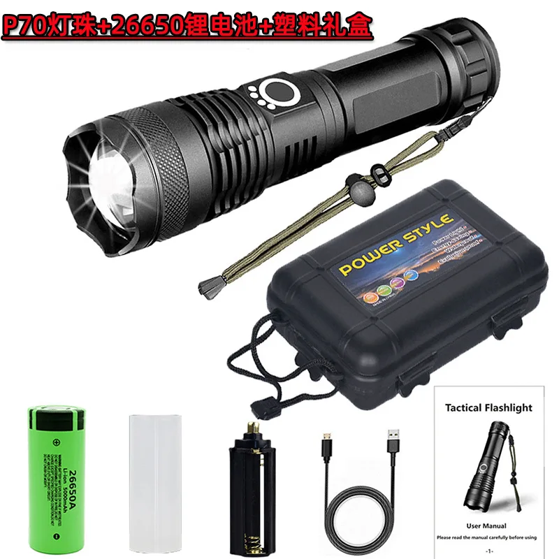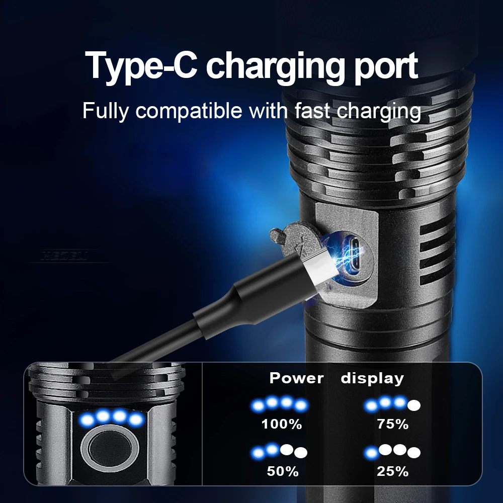 The latest long-range flashlight uses a LED wick as the light-emitting point, It is the flashlight with the longest illumination distance on the market. There are 5 modes, suitable for various places. The flashlight uses 18650 or 26650 batteries and can be used for 6-15 hours on a single charge. With 4-level power display, you can know the remaining power at any time, and use the C-type fast charging charger to charge, and the charging speed is twice that of ordinary chargers. It is a must-have for outdoor activities and a small helper for the family.
