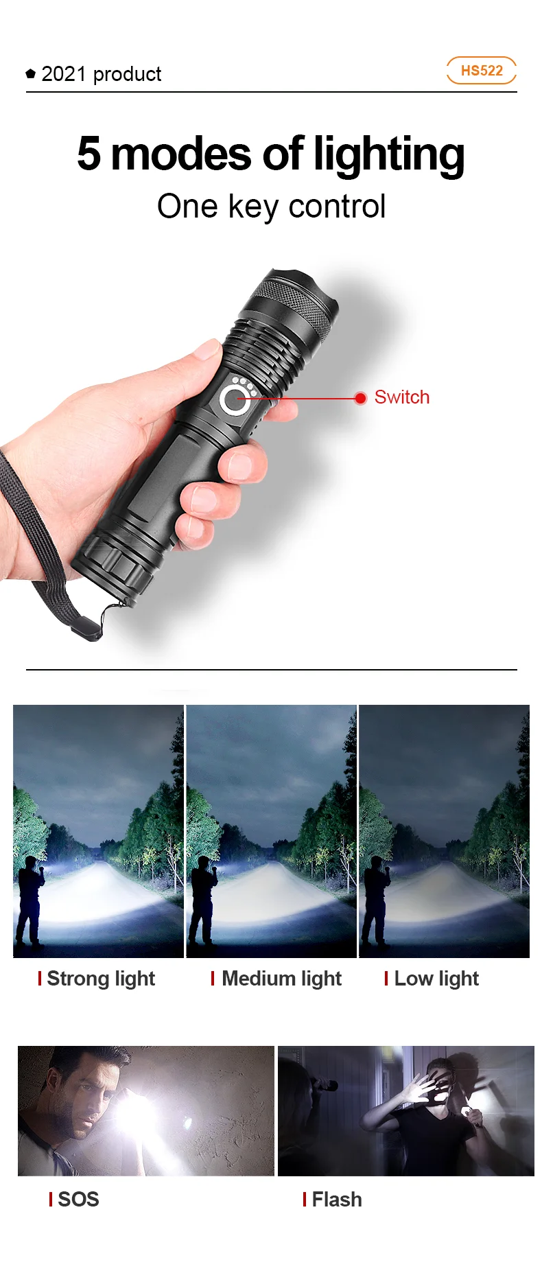 9. Switch mode: 5 Modes (strong light-medium light-low light-strobe-SOS)