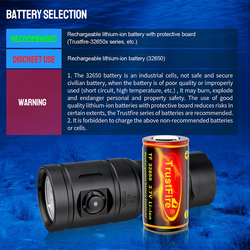 1. The 32650 battery is an industrial cells, not safe and secure civilian battery, when the battery is of poor quality or improperly used (short circuit, high temperature, etc.) , lt may burn, explode and endanger personal and property safety. The use of good quality lithium-ion batteries with protective board reduces risks in certain extents, the Trustfire series of batteries are recommended