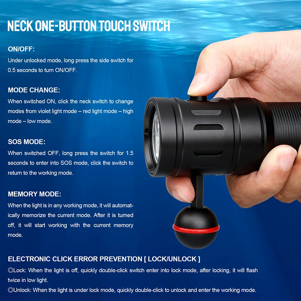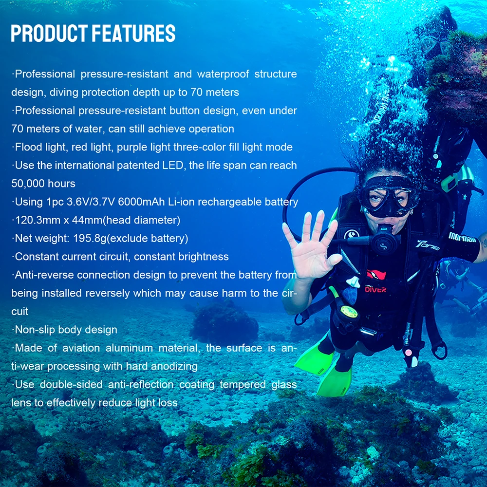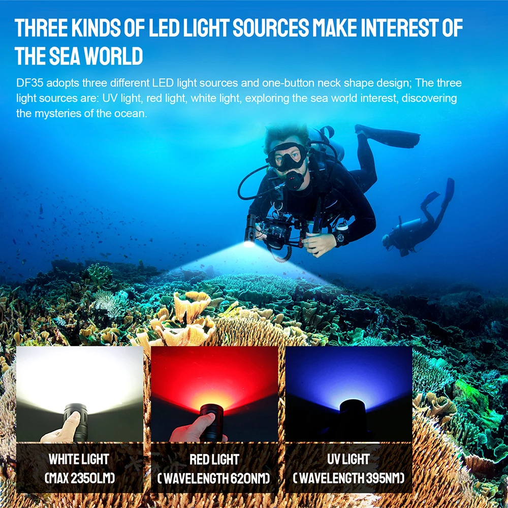 DF35 adopts three different LED light sources and one-button neck shape design; The three light sources are: UV light, red light, white light, exploring the sea world interest, discovering the mysteries of the ocean.
