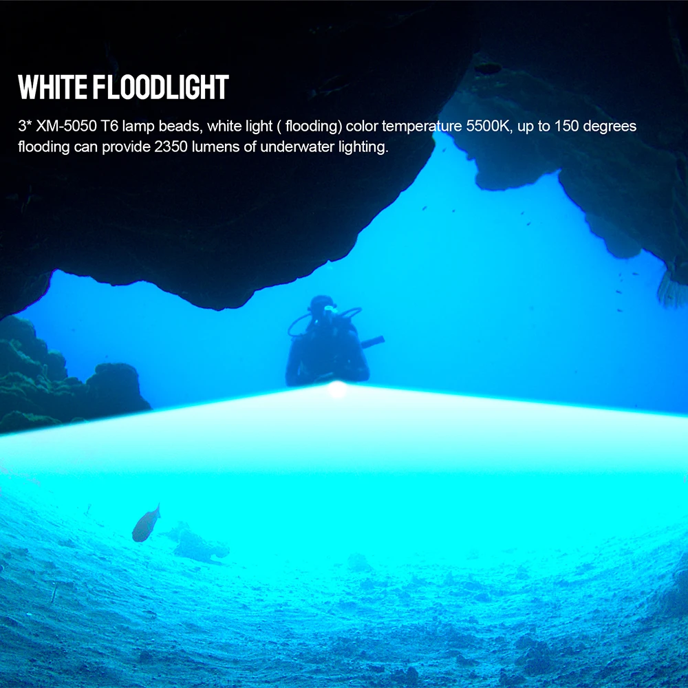 3* XM-5050 T6 lamp beads, white light ( flooding) color temperature 5500K, up to 150 degrees flooding can provide 2350 lumens of underwater lighting.