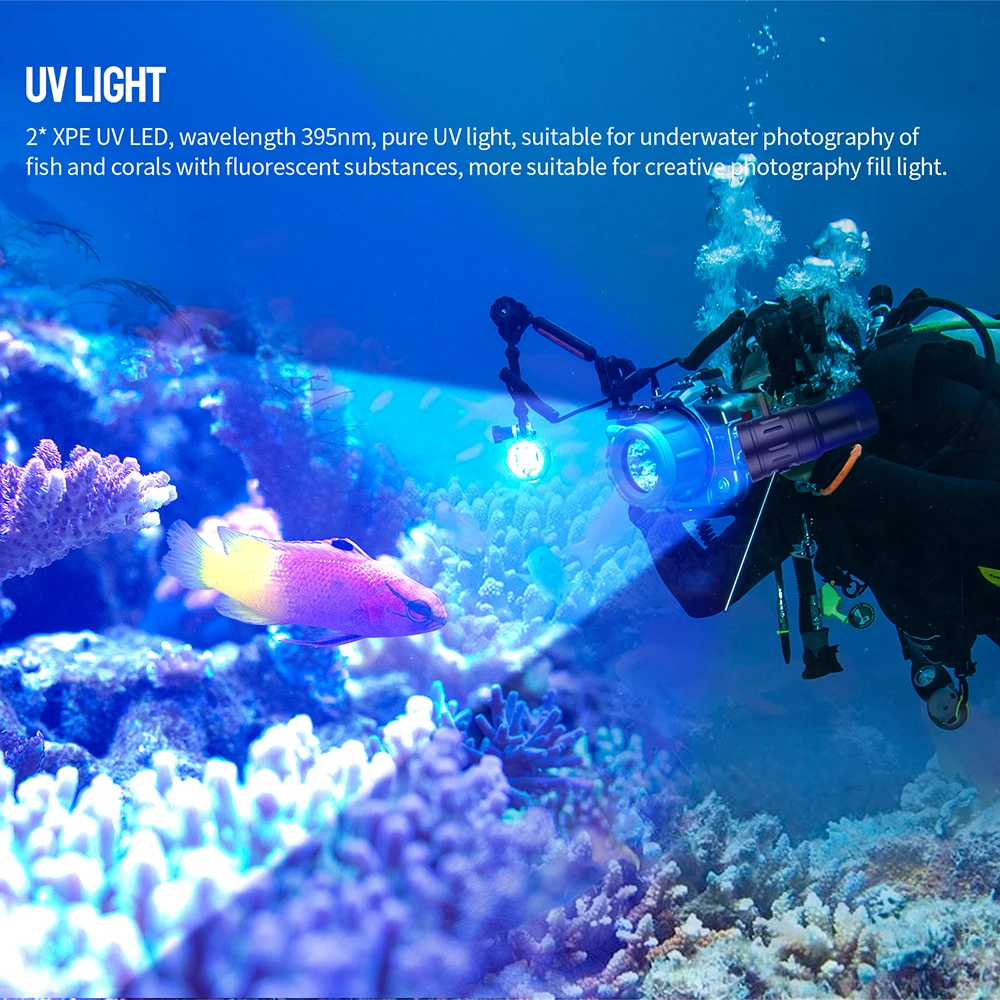 2* XPE UV LED, wavelength 395nm, pure UV light, suitable for underwater photography offish and corals with fluorescent substances, more suitable for creative photography fill light.