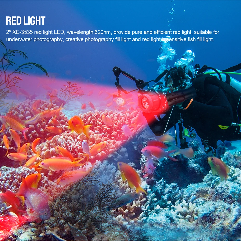 2* XE-3535 red light LED, wavelength 620nm, provide pure and efficient red light, suitable for underwater photography, creative photography fill light and red light inensitive fish fill light.