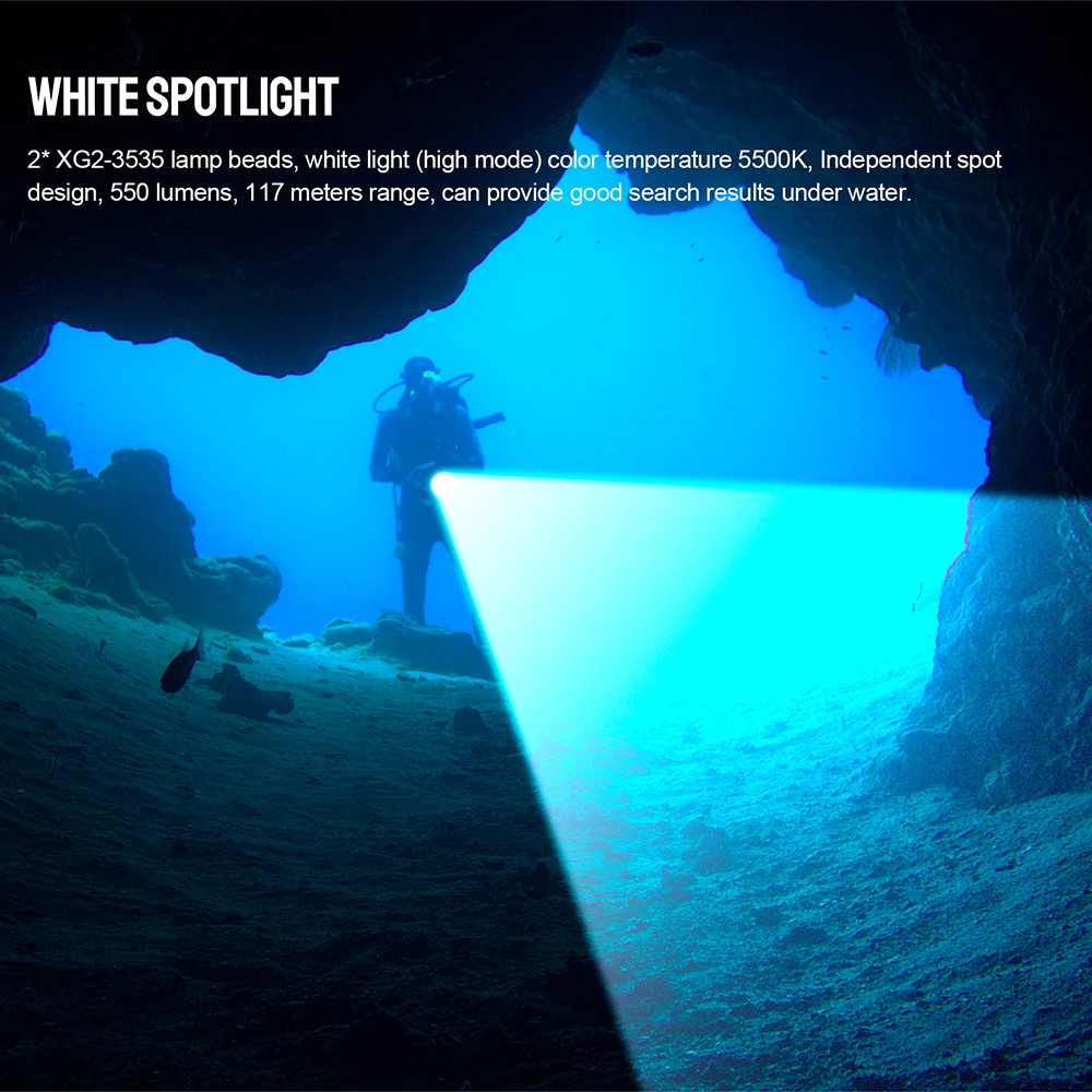 design, 550 lumens, 117 meters range, can provide good search results under water.