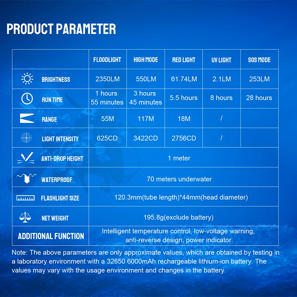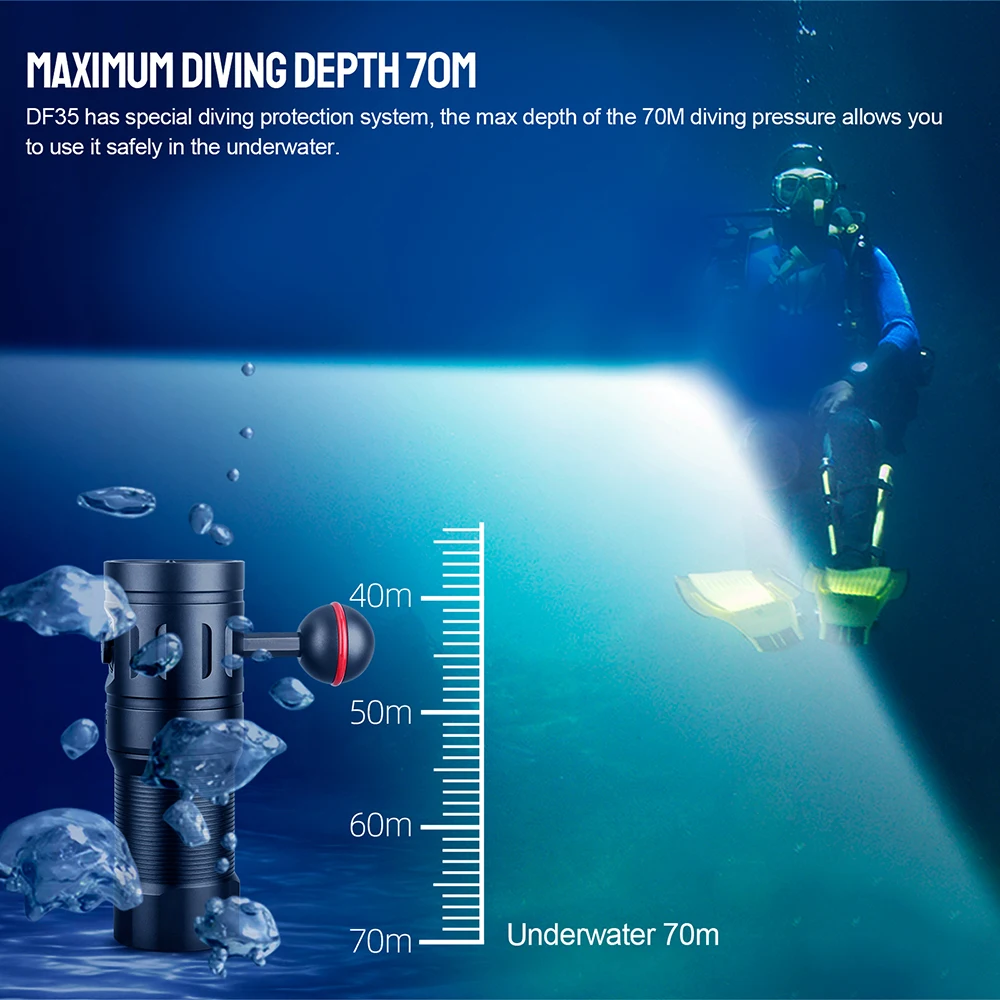 DF35 maximum 2350 lumens, maximum diving depth 70m, maximum range up to 117m.