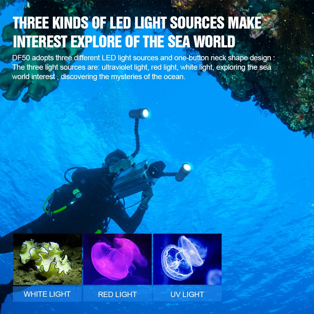 DF50 adopts three different LED light sources and one-button neck shape design; the three light sources are: ultraviolet light, red light, and white light, which can meet different needs.