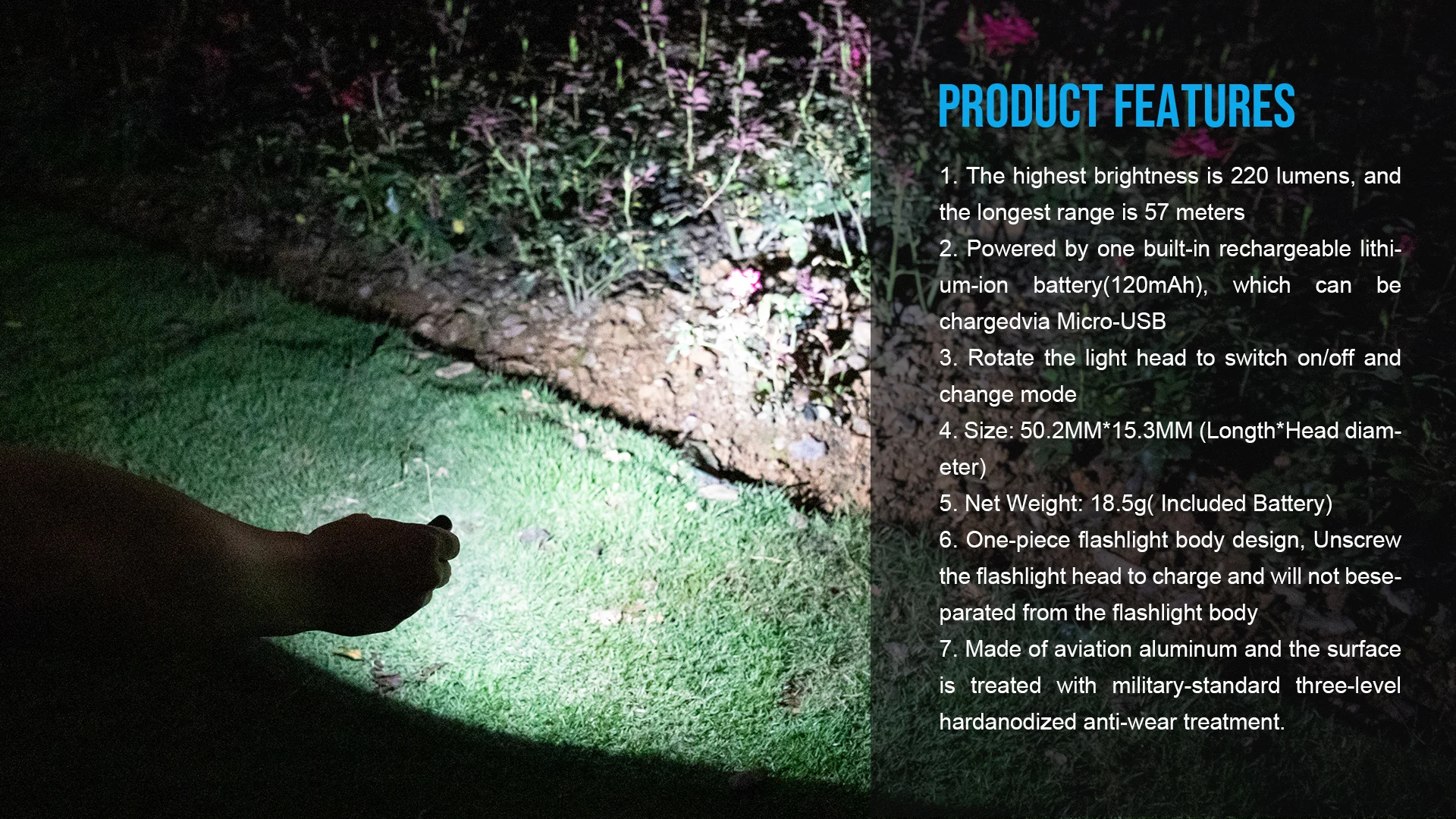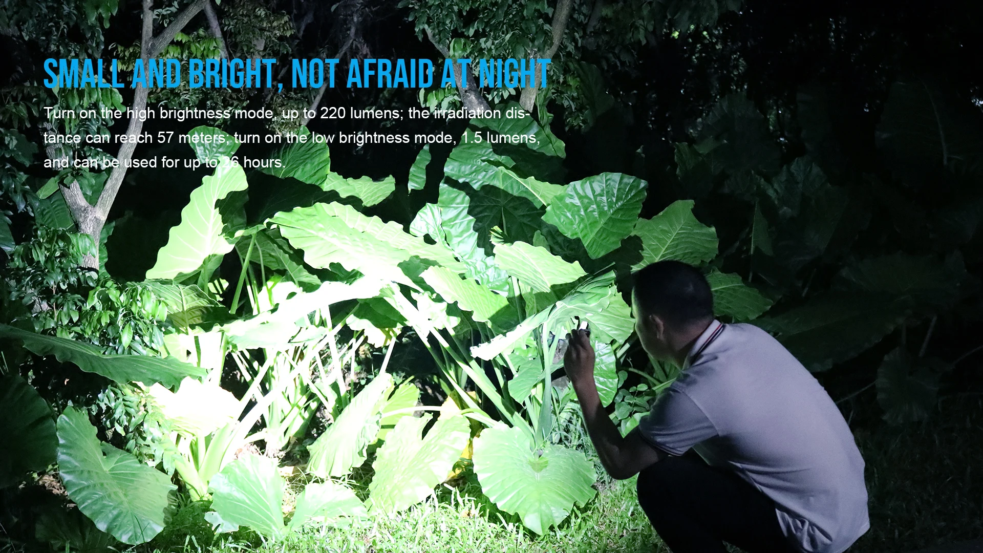 Turn on the high brightness mode, up to 220 lumens; the irradiation distance can reach 57 meters; turn on the low brightness mode, 1.5 lumens and can be used for up to 26 hours