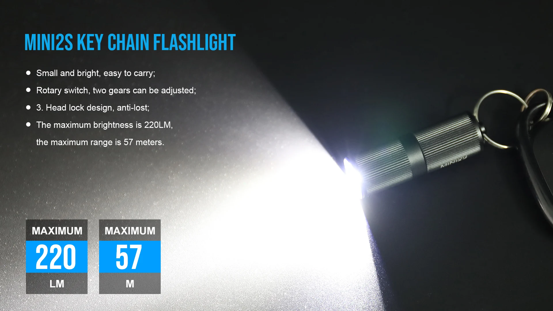 Turn on the high brightness mode, up to 220 lumens; the irradiation distance can reach 57 meters; turn on the low brightness mode, 1.5 lumens and can be used for up to 26 hours