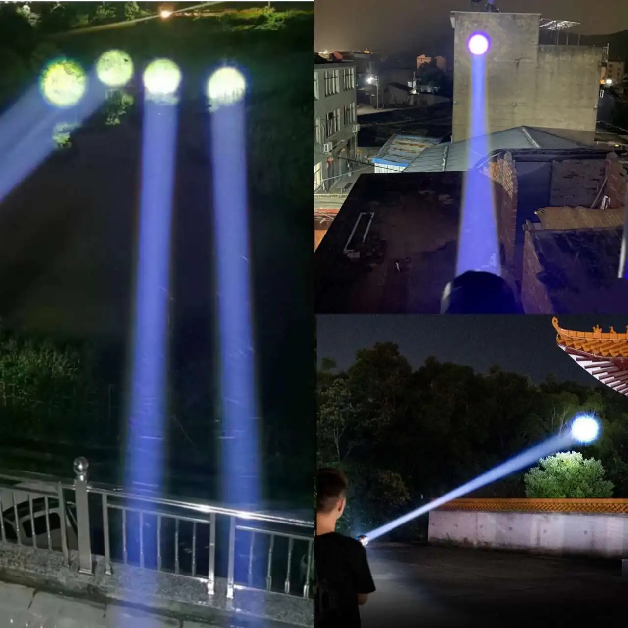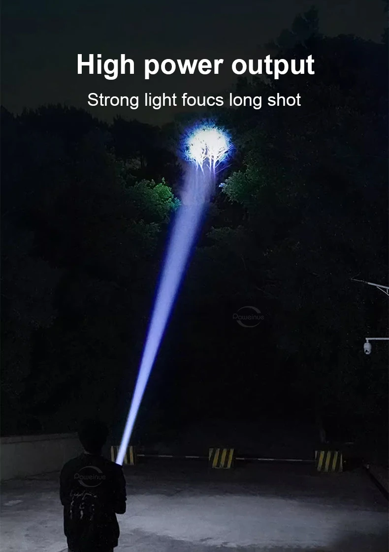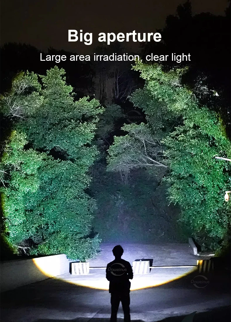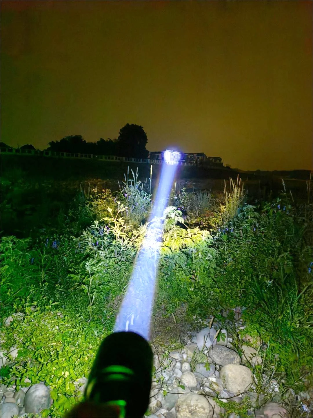 The flashlight uses the latest 500W wick, which is bright and has a large aperture. It can illuminate 400 square meters and has a telescopic zoom of 4000 meters. It is safe and energy-saving. The 500W wick has a longer service life than ordinary XHP series wicks. The flashlight is made of aluminum alloy, with a compact structure and super strong It is waterproof and will not be damaged even if dropped from 3 meters.