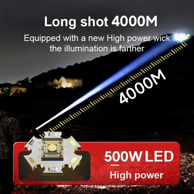 Super powerful 500W Led flashlight long distance telescopic zoom 4000M