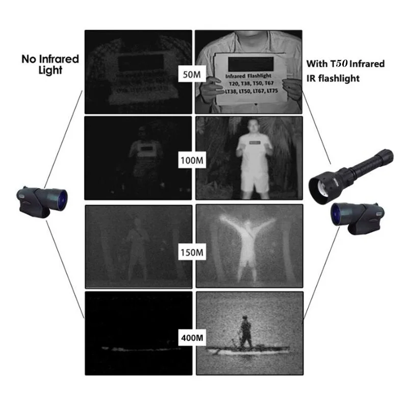 UF-T50 is not a normal flashlight, Not suitable for general lighting.The UF-T50 emits infrared light at 850nm/940nm, which is invisible to the naked eye. To use this infrared illuminator, Need professional equipment cooperation.you must use night vision equipment such as night vision single glasses, infrared cameras, DIY night vision and infrared support.