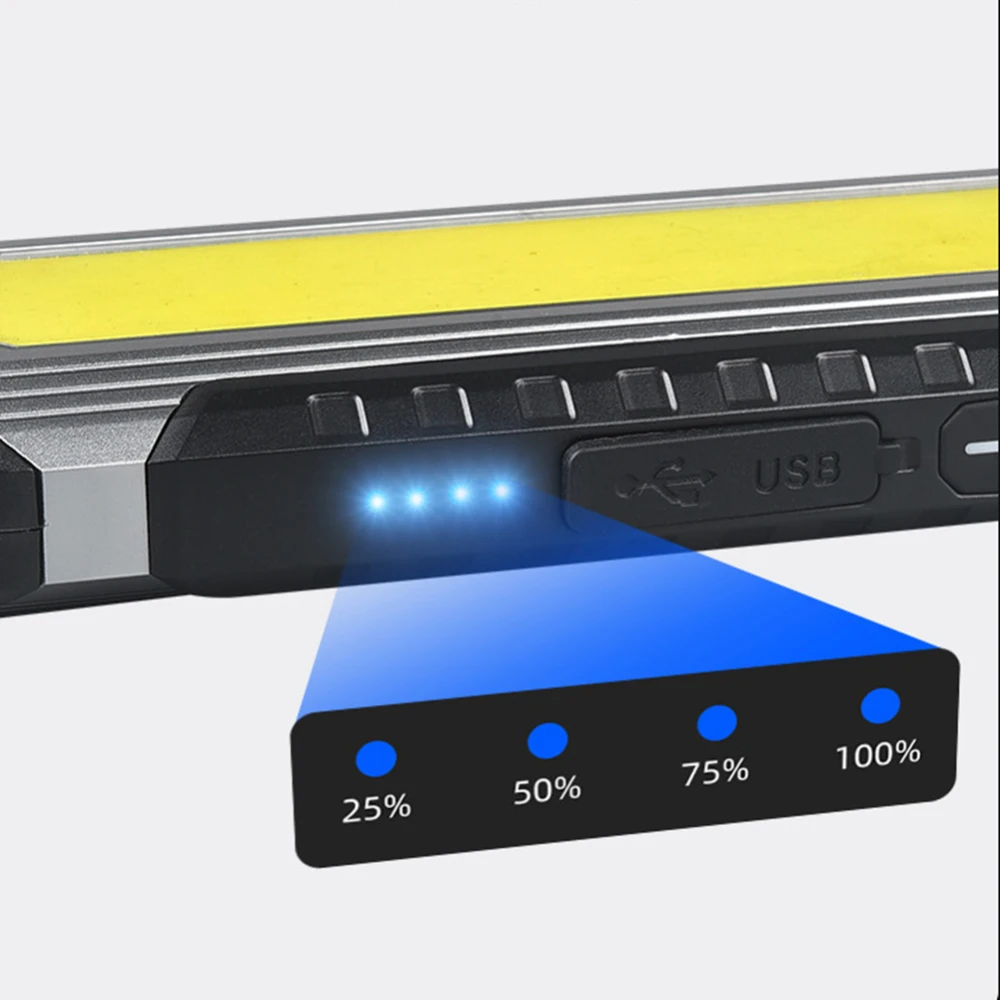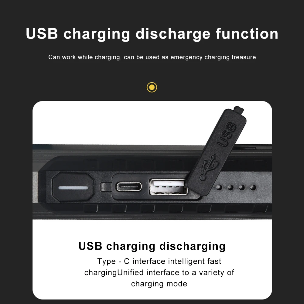 Features support output can be used as a magnet on the back of the charging bank, which can be adsorbed on iron objects as a work light. The back hook design can be used to suspend standing COB dual row red light design plays a warning role. One lamp can be used for multiple purposes and multiple scenarios
